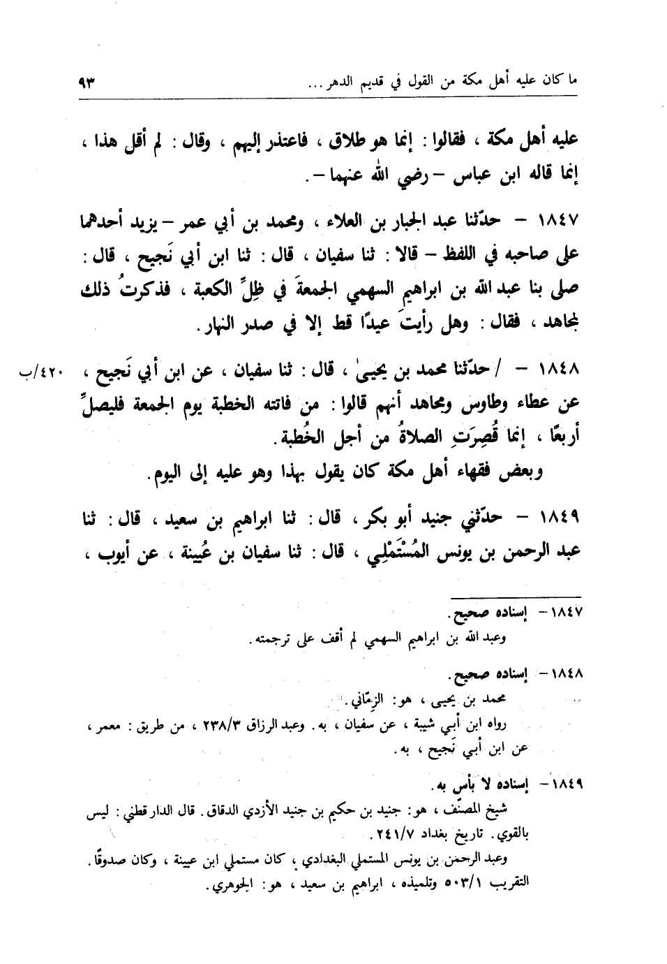 1875 - حَدَّثَنَا مُحَمَّدُ بْنُ أَبِي عُمَرَ، وَمُحَمَّدُ بْنُ مَنْصُورٍ يَزِيدُ أَحَدُهُمَا عَلَى صَاحِبِهِ قَالَا: ثنا سُفْيَانُ، عَنْ ابْنِ أَبِي نَجِيحٍ، قَالَ: رَأَيْتُ طَاوُسًا لَقِيَ أَبِي، فَسَأَلَهُ عَنْ حَدِيثٍ، فَرَأَيْتُ طَاوُسًا يَعْقِدُهُ بِيَدِهِ كَأَنَّهُ يَتَحَفَّظُهُ، فَقَالَ -[119]- أَبِي: إِنَّ لُقْمَانَ قَالَ: إِنَّ مِنَ الصَّمْتِ حِكَمًا، وَقَلِيلٌ فَاعِلُهُ قَالَ: " يَا أَبَا نَجِيحٍ §مَنْ تَكَلَّمَ وَاتَّقَى اللهَ خَيْرٌ مِمَّنْ صَمَتَ وَاتَّقَى اللهَ " زَادَ ابْنُ أَبِي عُمَرَ فِي حَدِيثِهِ، فَقَالَ لَهُ أَبِي: لَوْ كَانَ مِنْ طُولِكَ فِي قِصَرِي خَرَجَ مِنَّا رَجُلَانِ تَامَّانِ قَالَ: وَكَانَ هَذَا طَوِيلًا وَالْآخَرُ قَصِيرًا
