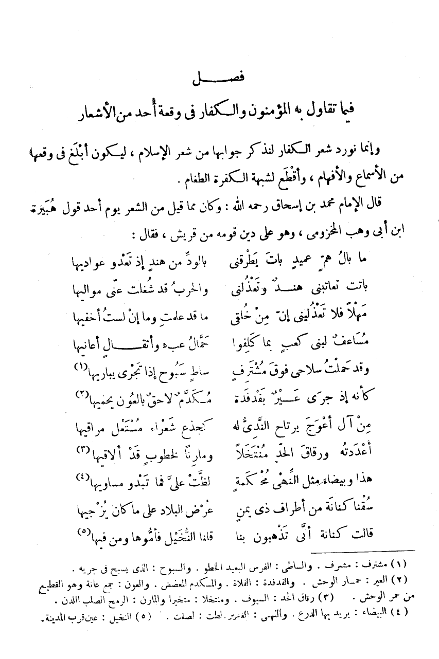 فَصْلٌ فِيمَا تَقَاوَلَ بِهِ الْمُؤْمِنُونَ وَالْكُفَّارُ فِي وَقْعَةِ أُحُدٍ مِنَ الْأَشْعَارِ وَإِنَّمَا نُورِدُ شِعْرَ الْكُفَّارِ لِنَذْكُرَ جَوَابَهَا مِنْ شِعْرِ الْإِسْلَامِ، لِيَكُونَ أَبْلَغَ فِي وَقْعِهَا مِنَ الْأَسْمَاعِ وَالْأَفْهَامِ، وَأَقْطَعَ لِشُبْهَةِ الْكَفَرَةِ الطَّغَامِ.
