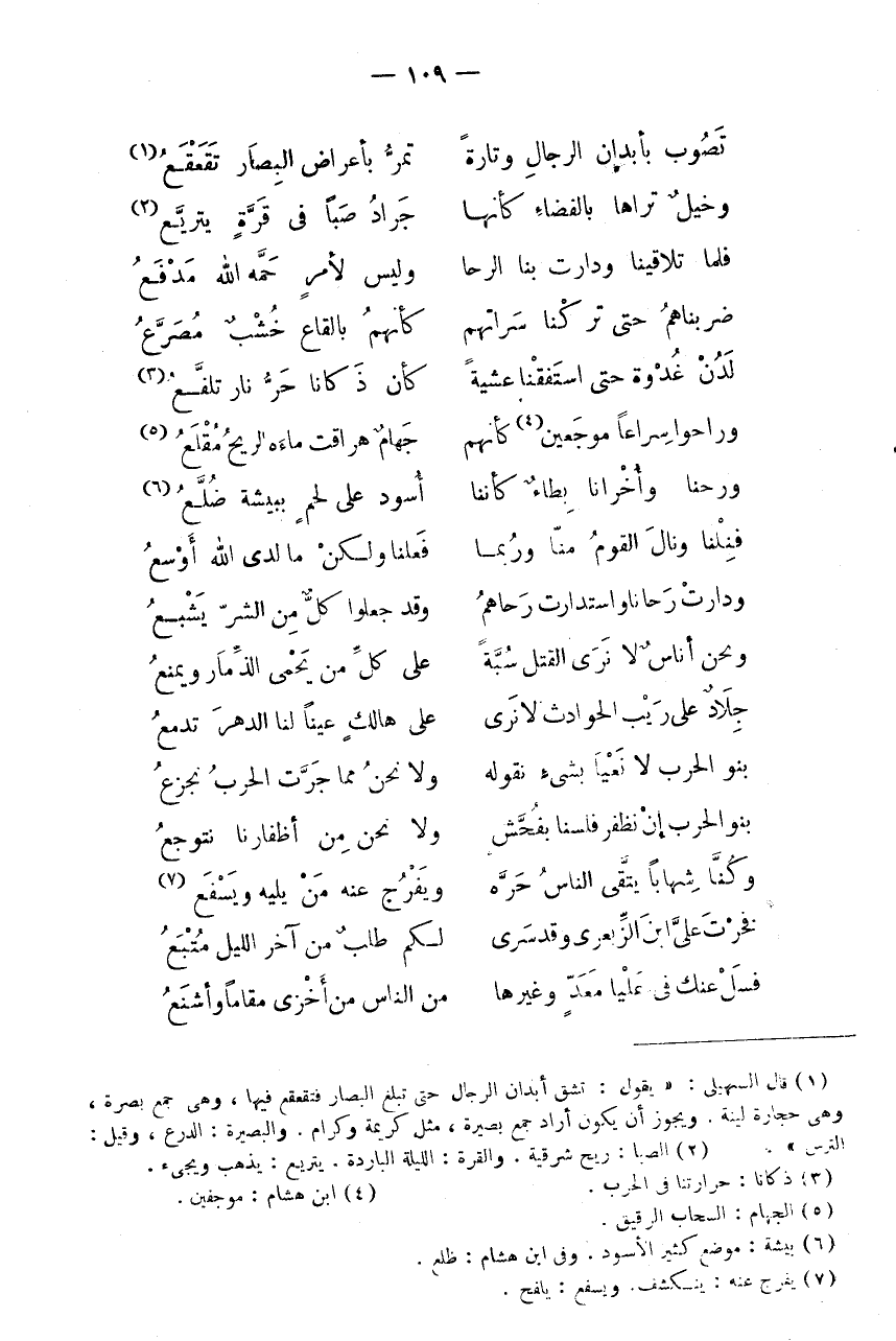تَصُوبُ بِأَبْدَانِ الرِّجَالِ وَتَارَةً * تَمُرُّ بِأَعْرَاضِ الْبِصَارِ تَقَعْقَعُ (1) وَخَيْلٌ تَرَاهَا بِالْفَضَاءِ كَأَنَّهَا * جَرَادُ صَبًا فِي قُرَّةٍ يَتَرَيَّعُ (2) فَلَمَّا تَلَاقَيْنَا وَدَارَتْ بِنَا الرَّحَا * وَلَيْسَ لِأَمْرٍ حَمَّهُ اللَّهُ مَدْفَعُ ضَرَبْنَاهُمْ حَتَّى تَرَكْنَا سَرَاتَهُمْ * كَأَنَّهُمْ بِالْقَاعِ خُشْبٌ مُصَرَّعُ لَدُنْ غُدْوَةً حَتَّى اسْتَفَقْنَا عَشِيَّةً * كَأَنَّ ذَكَانَا حَرُّ نَارٍ تَلَفَّعُ (3) وَرَاحُوا سِرَاعًا مُوجَعِينَ (4) كَأَنَّهُمْ * جَهَامٌ هَرَاقَتْ مَاءَهُ الرِّيحُ مُقْلِعُ (5) وَرُحْنَا وَأُخْرَانَا بطاء كأننا * أسود على لحم ببيشة ضلع (6) فَنِلْنَا وَنَالَ الْقَوْمُ مِنَّا وَرُبَّمَا * فَعَلْنَا وَلَكِنْ مَا لَدَى اللَّهِ أَوْسَعُ وَدَارَتْ رَحَانَا وَاسْتَدَارَتْ رَحَاهُمُ * وَقَدْ جَعَلُوا كُلٌّ مِنَ الشَّرِّ يَشْبَعُ وَنَحْنُ أُنَاسٌ لَا نَرَى الْقَتْلَ سُبَّةً * عَلَى كُلِّ مَنْ يَحْمِي الذِّمَارَ وَيَمْنَعُ جِلَادٌ عَلَى رَيْبِ الْحَوَادِثِ لَا نَرَى * عَلَى هَالِكٍ عَيْنًا لَنَا الدَّهْرُ تَدْمَعُ بَنُو الْحَرْبِ لَا نَعْيَا بشئ نَقُولُهُ * وَلَا نَحْنُ مِمَّا جَرَّتِ الْحَرْبُ نَجْزَعُ بَنُو الْحَرْبِ إِنْ نَظْفَرْ فَلَسْنَا بِفُحَّشٍ * وَلَا نَحن من أظفارنا نَتَوَجَّعُ وَكُنَّا شِهَابًا يَتَّقِي النَّاسُ حَرَّهُ * وَيَفْرُجُ عَنْهُ مَنْ يَلِيهِ وَيَسْفَعُ (7) فَخَرَّتْ عَلَى ابْنِ الزِّبَعْرَى وَقَدْ سَرَى * لَكُمْ طَلَبٌ مِنْ آخِرِ اللَّيْلِ مُتْبَعُ فَسَلْ عَنْكَ فِي عُلْيَا مَعَدٍّ وَغَيْرِهَا * مِنَ النَّاسِ مَنْ أَخْزَى مَقَامًا وَأَشْنَعُ