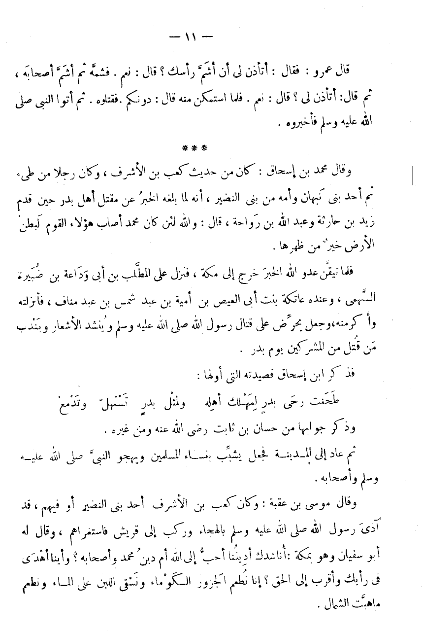 * * * وَقَالَ مُحَمَّدُ بْنُ إِسْحَاقَ: كَانَ مِنْ حَدِيثِ كَعْبِ بن الاشرف، وَكَانَ رجلا من طئ ثُمَّ أَحَدُ بَنِي نَبْهَانَ وَأُمُّهُ مِنْ بَنِي النَّضِيرِ، أَنَّهُ لَمَّا بَلَغَهُ الْخَبَرُ عَنْ مَقْتَلِ أَهِلِ بَدْرٍ حِينَ قَدِمَ زَيْدُ بْنُ حَارِثَةَ وَعَبْدُ اللَّهِ بْنُ رَوَاحَةَ، قَالَ: وَاللَّهِ لَئِنْ كَانَ مُحَمَّدٌ أَصَابَ هَؤُلَاءِ الْقَوْمَ لَبَطْنُ الْأَرْضِ خَيْرٌ مِنْ ظَهْرِهَا.