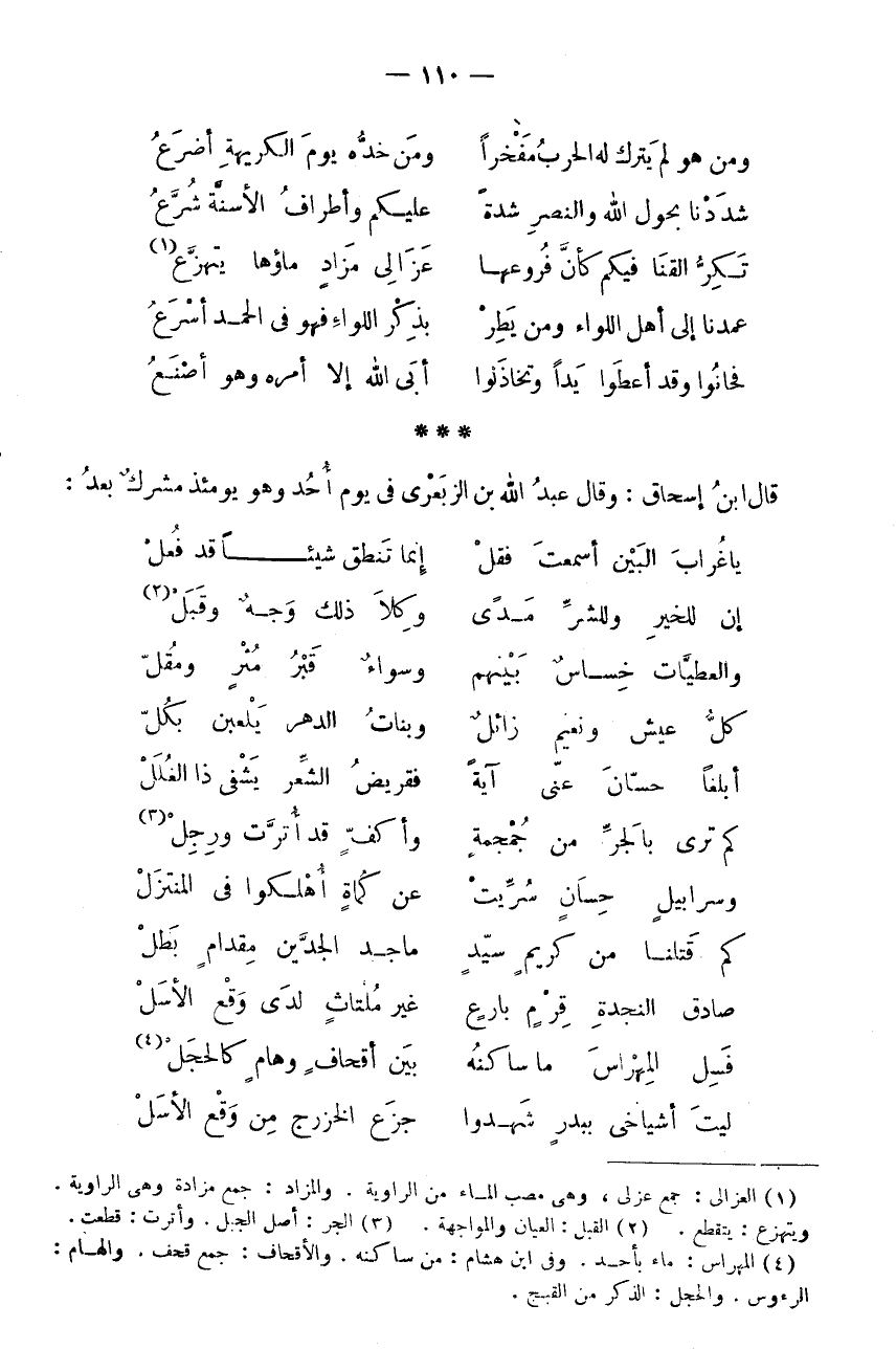 وَمَنْ هُوَ لَمْ يَتْرُكْ لَهُ الْحَرْبُ مَفْخَرًا * وَمَنْ خَدُّهُ يَوْمَ الْكَرِيهَةِ أَضْرَعُ شَدَدْنَا بِحَوَلِ اللَّهِ وَالنَّصْرِ شَدَّةً * عَلَيْكُمْ وَأَطْرَافُ الْأَسِنَّةِ شُرَّعُ تكر القنا فِيكُم كَأَن فروعها * عَزَالِي مَزَادٍ مَاؤُهَا يَتَهَزَّعُ (1) عَمَدْنَا إِلَى أَهْلِ اللِّوَاءِ وَمَنْ يَطِرْ * بِذِكْرِ اللِّوَاءِ فَهُوَ فِي الْحَمد أسْرع فحانوا وَقَدْ أَعْطَوْا يَدًا وَتَخَاذَلُوا * أَبَى اللَّهُ إِلَّا أَمَرَهُ وَهُوَ أَصْنَعُ * * * قَالَ ابْنُ إِسْحَاقَ: وَقَالَ عَبْدُ اللَّهِ بْنُ الزِّبَعْرَى فِي يَوْمِ أُحُدٍ وَهُوَ يَوْمَئِذٍ مُشْرِكٌ بَعْدُ: يَا غُرَابَ الْبَيْنِ أَسْمَعْتَ فَقُلْ * إِنَّمَا تَنْطِقُ شَيْئًا قَدْ فُعِلْ إِنَّ لِلْخَيْرِ وَلِلشَّرِّ مَدًى * وَكِلَا ذَلِكَ وَجْهٌ وَقَبَلْ (2) وَالْعَطِيَّاتُ خِسَاسٌ بَيْنَهُمْ * وَسَوَاءٌ قَبْرُ مُثْرٍ وَمُقِلْ كُلُّ عَيْشٍ وَنَعِيمٍ زَائِلٌ * وَبَنَاتُ الدَّهْرِ يلعبن بِكُل أبلغنا حَسَّانَ عَنِّي آيَةً * فَقَرِيضُ الشِّعْرِ يَشْفِي ذَا الْغُلَلْ كَمْ تَرَى بِالْجَرِّ مِنْ جُمْجُمَةٍ * وَأَكُفٍّ قَدْ أُتِرَّتْ وَرَجَلْ (3) وَسَرَابِيلَ حِسَانٍ سُرِيَتْ * عَنْ كُمَاةٍ أُهْلِكُوا فِي الْمُنْتَزَلْ كَمْ قَتَلْنَا مِنْ كَرِيمٍ سَيِّدٍ * مَاجِدِ الْجَدَّيْنِ مِقْدَامٍ بَطَلْ صَادِقِ النَّجْدَةِ قَرْمٍ بَارِعٍ * غَيْرِ مُلْتَاثٍ لَدَى وَقْعِ الْأَسَلْ فَسَلِ الْمِهْرَاسَ مَا سَاكِنُهُ * بَيْنَ أَقْحَافٍ وَهَامٍ كَالْحَجَلْ (4) لَيْتَ أَشْيَاخِي بِبَدْرٍ شَهِدُوا * جَزَعَ الْخَزْرَجِ مِنْ وَقع الاسل