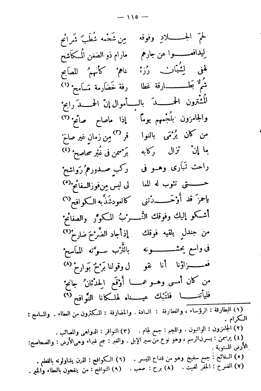 لَحْمَ الْجِلَادِ وَفَوْقَهُ * مِنْ شَحْمِهِ شُطَبٌ شَرَائِحْ ليدافعوا عَن جارهم * مارام ذُو الضِّغْنِ الْمُكَاشِحْ لَهَفِي لِشُبَّانٍ رُزِئْ * نَاهُمْ كَأَنَّهُمُ الْمَصَابِحْ شُمٍّ بَطَارِقَةٍ غَطَا * رِفَةٍ خَضَارِمَةٍ مسامح (1) المشترون الْحَمد بالاموال إِنَّ الْحَمْدَ رَابِحْ وَالْجَامِزُونَ بِلُجْمِهِمْ يَوْمًا * إِذَا مَا صَاحَ صَائِحْ (2) مَنْ كَانَ يُرْمَى بِالنَّوَا * قِرِ (3) مِنْ زَمَانٍ غَيْرِ صَالِحْ مَا إِنْ تَزَالُ رِكَابُهُ * يَرْسِمْنَ فِي غُبْرٍ صَحَاصِحْ (4) رَاحَتْ تُبَارَى وَهْوَ فِي * رَكْبٍ صُدُورُهُمُ رَوَاشِحْ حَتَّى تَئُوبَ لَهُ الْمَعَا * لِي لَيْسَ مِنْ فَوْزِ السفائح (5) يَا حَمْزَة قد أوحدتني * كالعود شَذَّ بِهِ الكوافح (6) أَشْكُو إِلَيْك وفوقك الترب المكور والصفائح