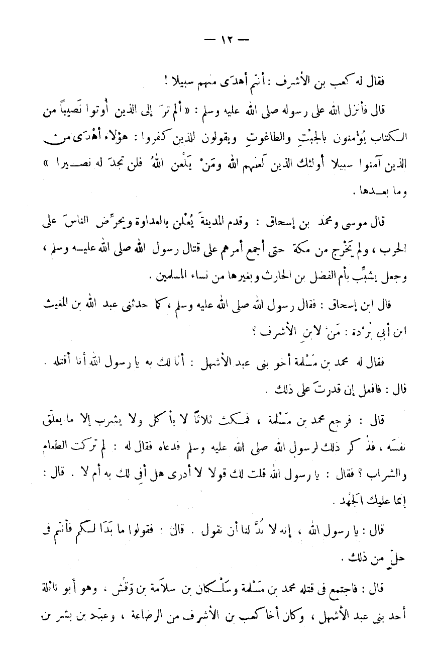 قَالَ ابْنُ إِسْحَاقَ: فَقَالَ رَسُولُ اللَّهِ صَلَّى اللَّهُ عَلَيْهِ وَسَلَّمَ، كَمَا حَدَّثَنِي عَبْدُ اللَّهِ بن المغيث ابْن أَبى بردة: من لِابْنِ الْأَشْرَفِ؟ فَقَالَ لَهُ مُحَمَّدُ بْنُ مَسْلَمَةَ أَخُو بَنِي عَبْدِ الْأَشْهَلِ: أَنَا لَكَ بِهِ يَا رَسُولَ اللَّهِ أَنَا أَقْتُلُهُ.