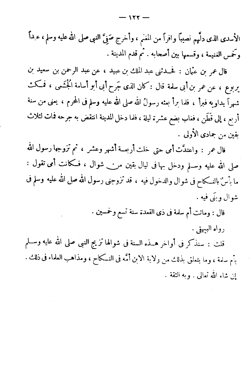 قَالَ عُمَرُ: وَاعْتَدَّتْ أُمِّي حَتَّى خلت أَرْبَعَة أشهر وَعشر، ثُمَّ تَزَوَّجَهَا رَسُولُ اللَّهِ صَلَّى اللَّهُ عَلَيْهِ وَسَلَّمَ وَدَخَلَ بِهَا فِي لَيَالٍ بَقِينَ مِنْ شَوَّالٍ، فَكَانَتْ أُمِّي تَقُولُ: مَا بَأْسٌ بِالنِّكَاحِ فِي شَوَّال وَالدُّخُول فِيهِ، قد تَزَوَّجَنِي رَسُولُ اللَّهِ صَلَّى اللَّهُ عَلَيْهِ وَسَلَّمَ فِي شَوَّال وَبنى فِيهِ.