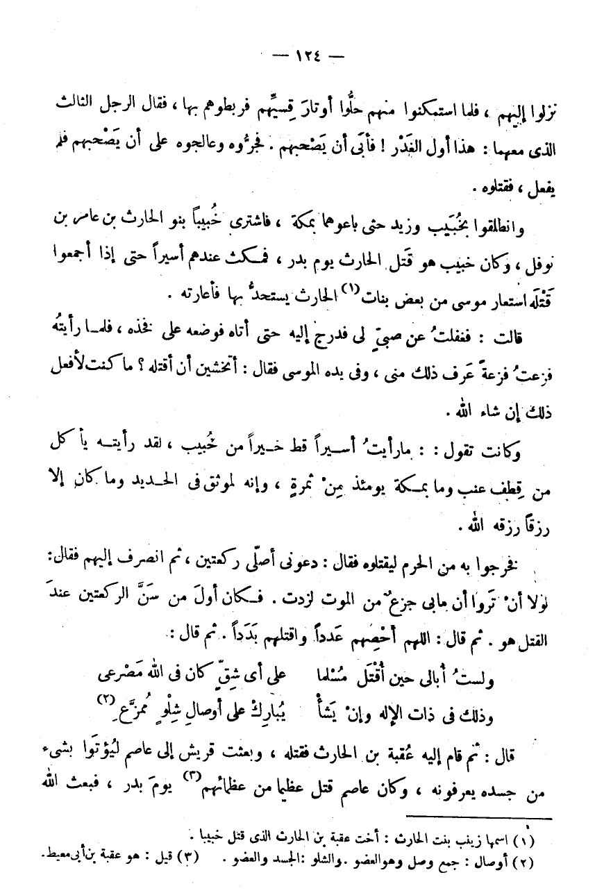 ثُمَّ قَالَ: وَلَسْتُ أُبَالِي حِينَ أُقْتَلُ مُسْلِمًا * عَلَى أَيِّ شِقٍّ كَانَ فِي اللَّهِ مصرعي وَذَلِكَ فِي ذَات الْإِلَه وَإِن يَشَأْ * يُبَارِكْ عَلَى أَوْصَالِ شِلْوٍ مُمَزَّعِ (2) قَالَ: ثُمَّ قَامَ إِلَيْهِ عُقْبَةُ بْنُ الْحَارِثِ فَقَتَلَهُ، وَبَعَثَتْ قُرَيْش إِلَى عَاصِم ليؤتوا بشئ