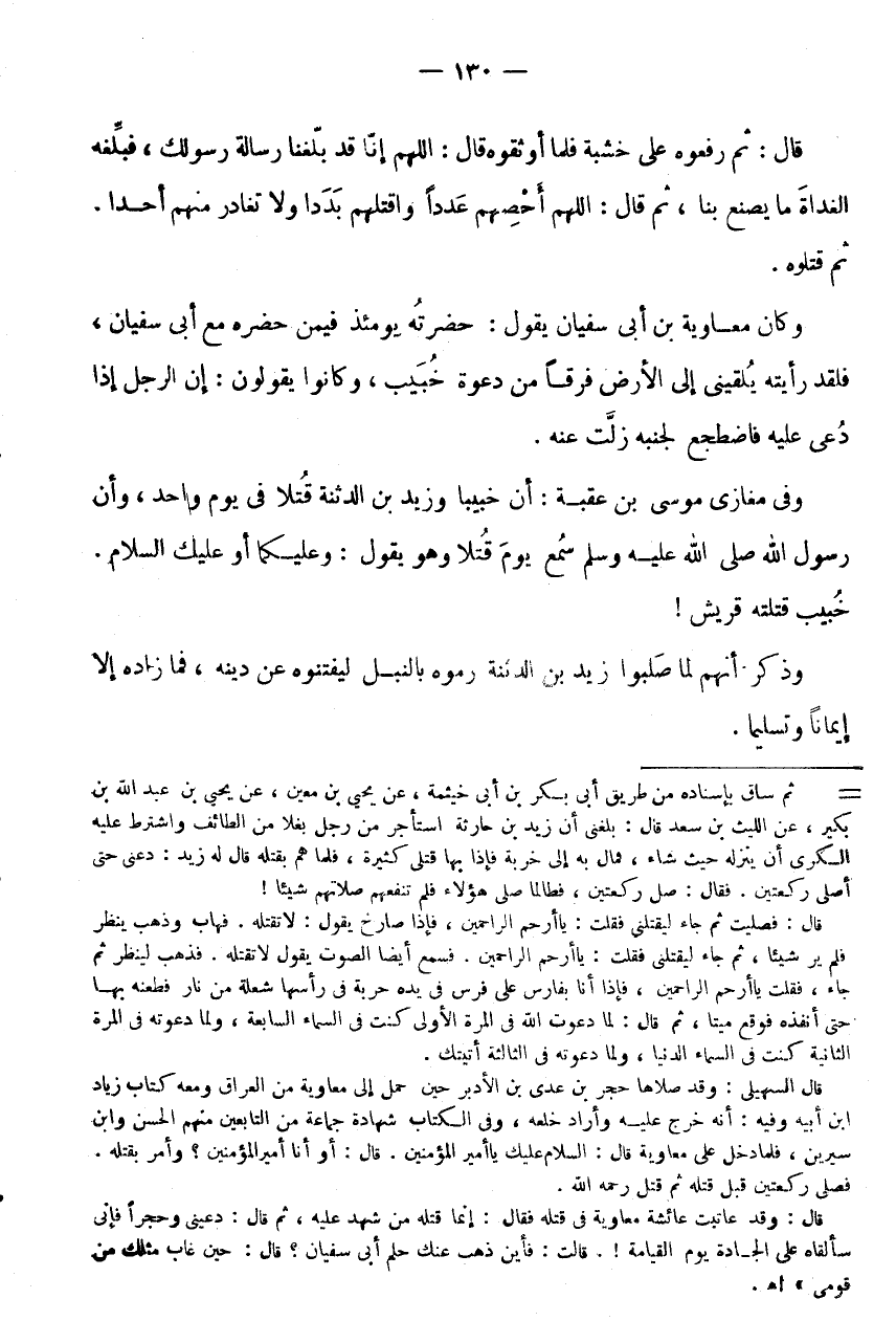 خُبَيْبٌ قَتَلَتْهُ قُرَيْشٌ! وَذَكَرَ أَنَّهُمْ لَمَّا صَلَبُوا زَيْدَ بْنَ الدَّثِنَةِ رَمَوْهُ بِالنَّبْلِ لِيَفْتِنُوهُ عَنْ دِينِهِ، فَمَا زَادَهُ إِلَّا إِيمَانًا وتسليما.