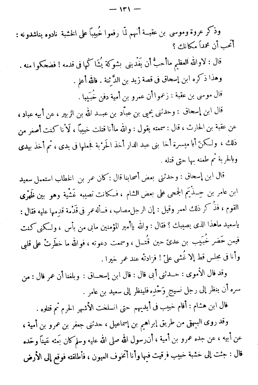 قَالَ ابْنُ هِشَامٍ: أَقَامَ خُبَيْبٌ فِي أَيْدِيهِمْ حَتَّى انْسَلَخَتِ الْأَشْهُرُ الْحُرُمُ ثُمَّ قَتَلُوهُ.