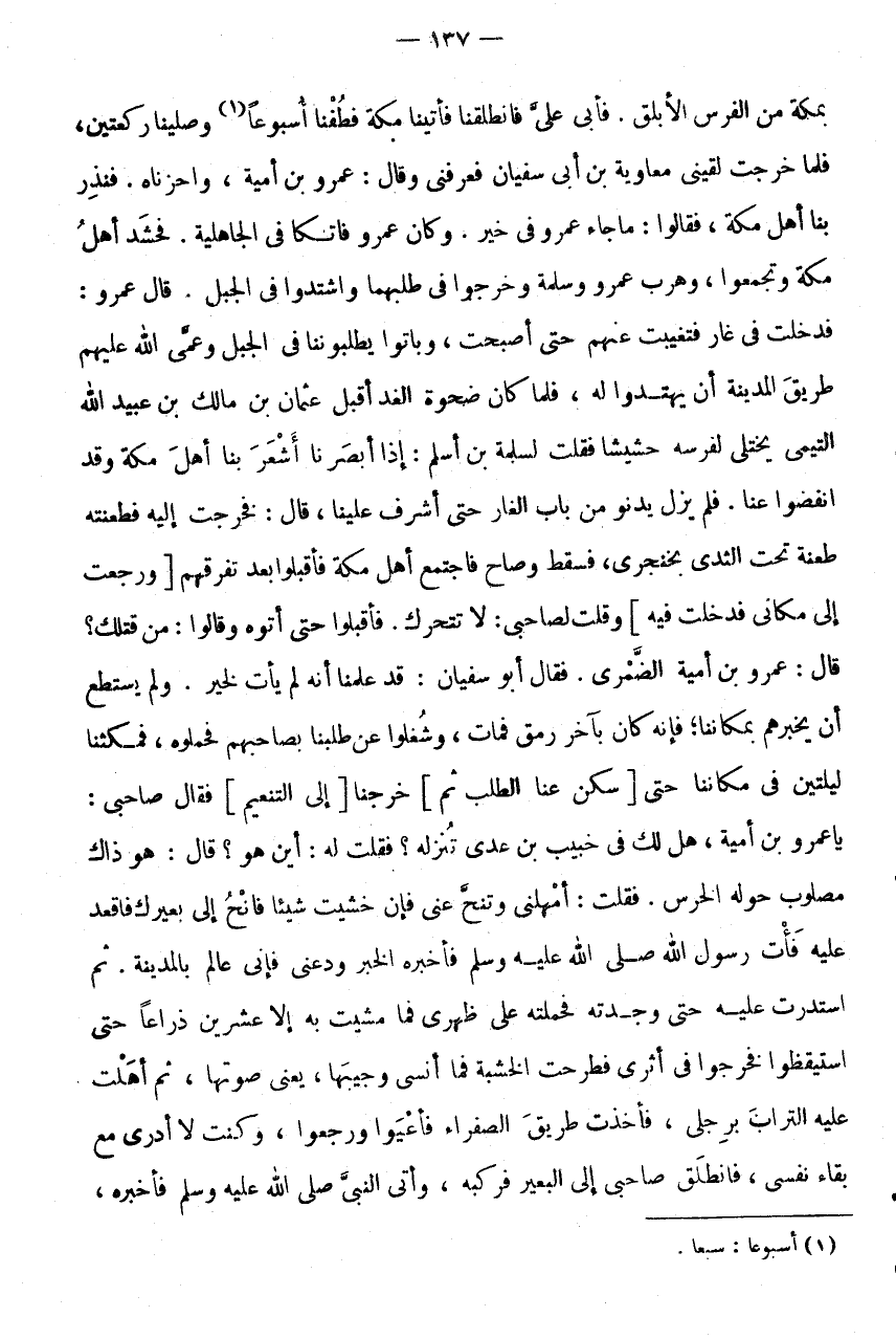 وَلَمْ يَسْتَطِعْ أَنْ يُخْبِرَهُمْ بِمَكَانِنَا، فَإِنَّهُ كَانَ بِآخِرِ رَمَقٍ فَمَاتَ، وَشُغِلُوا عَنْ طَلَبِنَا بِصَاحِبِهِمْ فَحَمَلُوهُ، فَمَكَثْنَا لَيْلَتَيْنِ فِي مَكَاننَا حَتَّى [سكن عَنَّا الطّلب ثمَّ] خرجنَا [إِلَى التَّنْعِيم] فَقَالَ صَاحِبِي: يَا عَمْرُو بْنَ أُمَيَّةَ، هَلْ لَك فِي خبيب بن عدى تنزله؟ فَقُلْتُ لَهُ: أَيْنَ هُوَ؟ قَالَ: هُوَ ذَاكَ مَصْلُوبٌ حَوْلَهُ الْحَرَسُ.