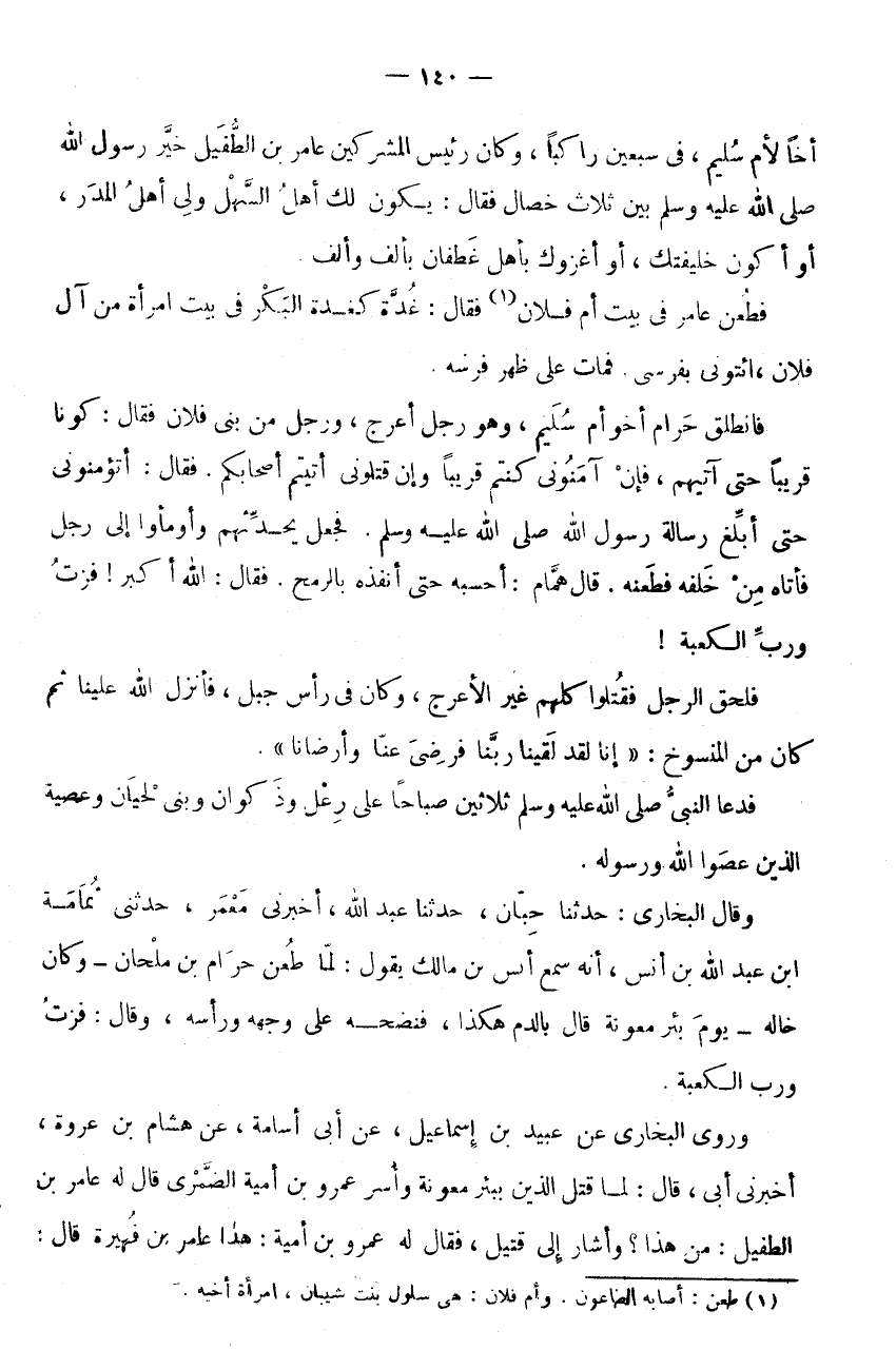 أَخًا لِأُمِّ سُلَيْمٍ، فِي سَبْعِينَ رَاكِبًا، وَكَانَ رَئِيسَ الْمُشْرِكِينَ عَامِرُ بْنُ الطُّفَيْلِ خَيَّرَ رَسُولُ اللَّهِ صَلَّى اللَّهُ عَلَيْهِ وَسَلَّمَ بَيْنَ ثَلَاثِ خِصَالٍ فَقَالَ: يَكُونُ لَكَ أَهْلُ السَّهْلِ وَلِي أَهْلُ الْمَدَرِ، أَوْ أَكُونُ خَلِيفَتَكَ، أَوْ أَغْزُوكَ بِأَهْلِ غَطَفَانَ بِأَلْفٍ وَأَلْفٍ.