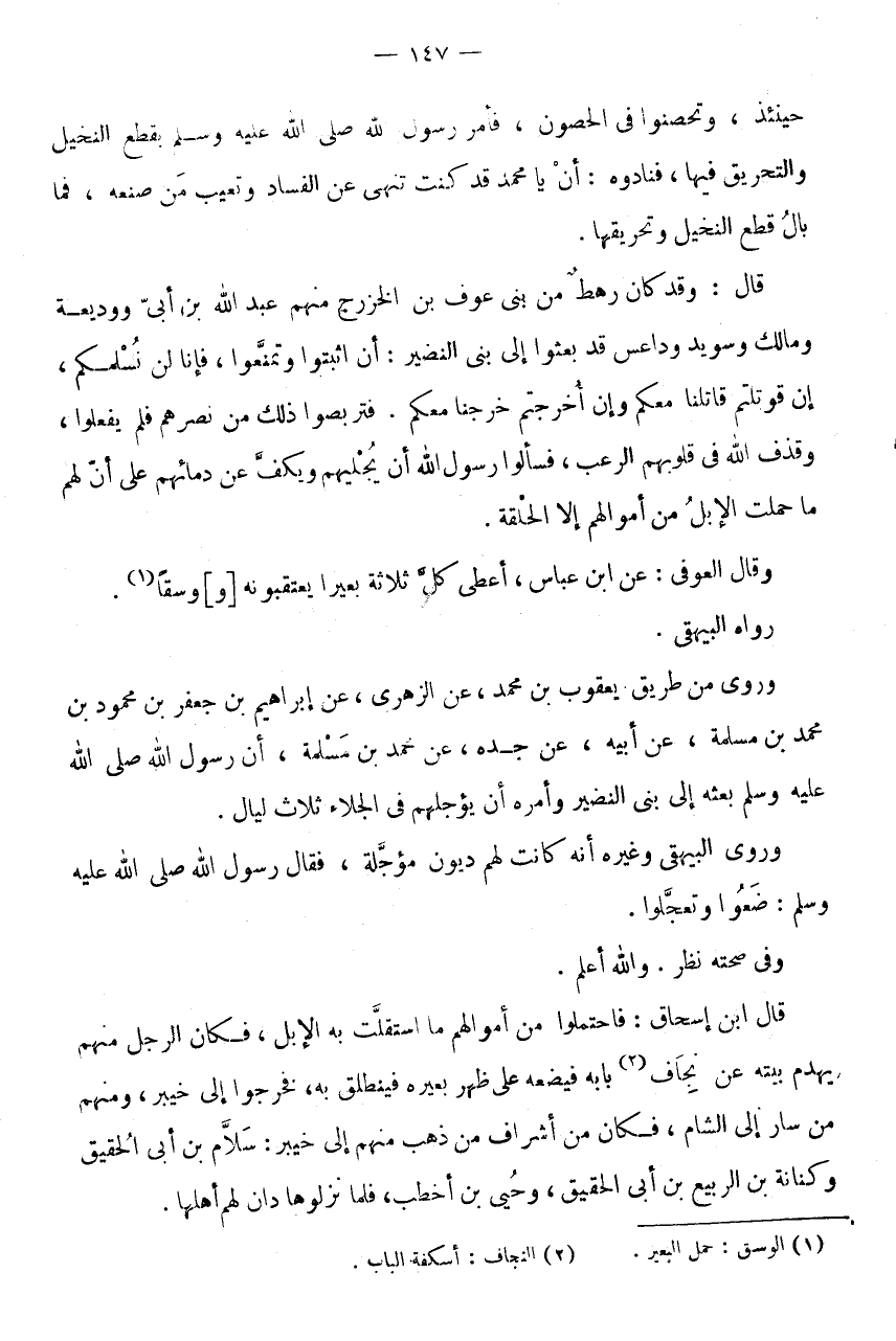 قَالَ ابْنُ إِسْحَاقَ: فَاحْتَمَلُوا مِنْ أَمْوَالِهِمْ مَا اسْتَقَلَّتْ بِهِ الْإِبِلُ، فَكَانَ الرَّجُلُ مِنْهُمْ يَهْدِمُ بَيْتَهُ عَنْ نِجَافِ (2) بَابِهِ فَيَضَعُهُ عَلَى ظَهْرِ بَعِيرِهِ فَيَنْطَلِقُ بِهِ، فَخَرَجُوا إِلَى خَيْبَرَ، وَمِنْهُمْ مَنْ سَارَ إِلَى الشَّامِ، فَكَانَ مِنْ أَشْرَافِ مَنْ ذَهَبَ مِنْهُمْ إِلَى خَيْبَرَ: سَلَّامُ بْنُ أَبِي الْحَقِيقِ وَكِنَانَةُ بْنُ الرَّبِيعِ بْنِ أَبِي الْحَقِيقِ، وَحُيَيُّ بْنُ أَخْطَبَ، فَلَمَّا نَزَلُوهَا دَانَ لَهُم أَهلهَا.