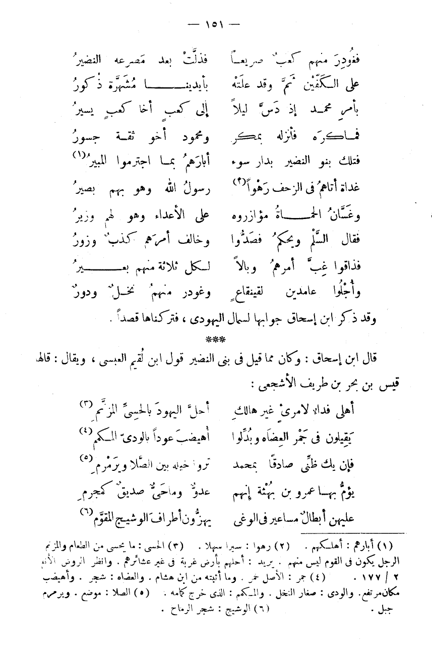* * * قَالَ ابْنُ إِسْحَاقَ: وَكَانَ مِمَّا قِيلَ فِي بَنِي النَّضِيرِ قَوْلُ ابْنِ لُقَيْمٍ الْعَبْسِيِّ، وَيُقَالُ: قَالَهَا قَيْسُ بْنُ بَحْرِ بْنِ طَرِيفٍ الْأَشْجَعِيِّ: أَهْلِي فِدَاءٌ لِامْرِئٍ غَيْرِ هَالِكٍ * أَحَلَّ الْيَهُودَ بِالْحَسِيِّ الْمُزَنَّمِ (3) يَقِيلُونَ فِي جمر العضاه وبدلوا * أهيضب عودا بِالْوَدِيِّ الْمُكَمَّمِ (4) فَإِنْ يَكُ ظَنِّي صَادِقًا بِمُحَمَّدٍ * تَرَوْا خَيْلَهُ بَيْنَ الصَّلَا وَيَرَمْرَمِ (5) يَؤُمُّ بِهَا عَمْرَو بْنَ بُهْثَةَ إِنَّهُمْ * عَدُوٌّ وَمَا حَيٌّ صَدِيقٌ كَمُجْرِمِ عَلَيْهِنَّ أَبْطَالٌ مَسَاعِيرُ فِي الْوَغَى * يهزون أَطْرَاف الوشيج الْمُقَوّم (6)