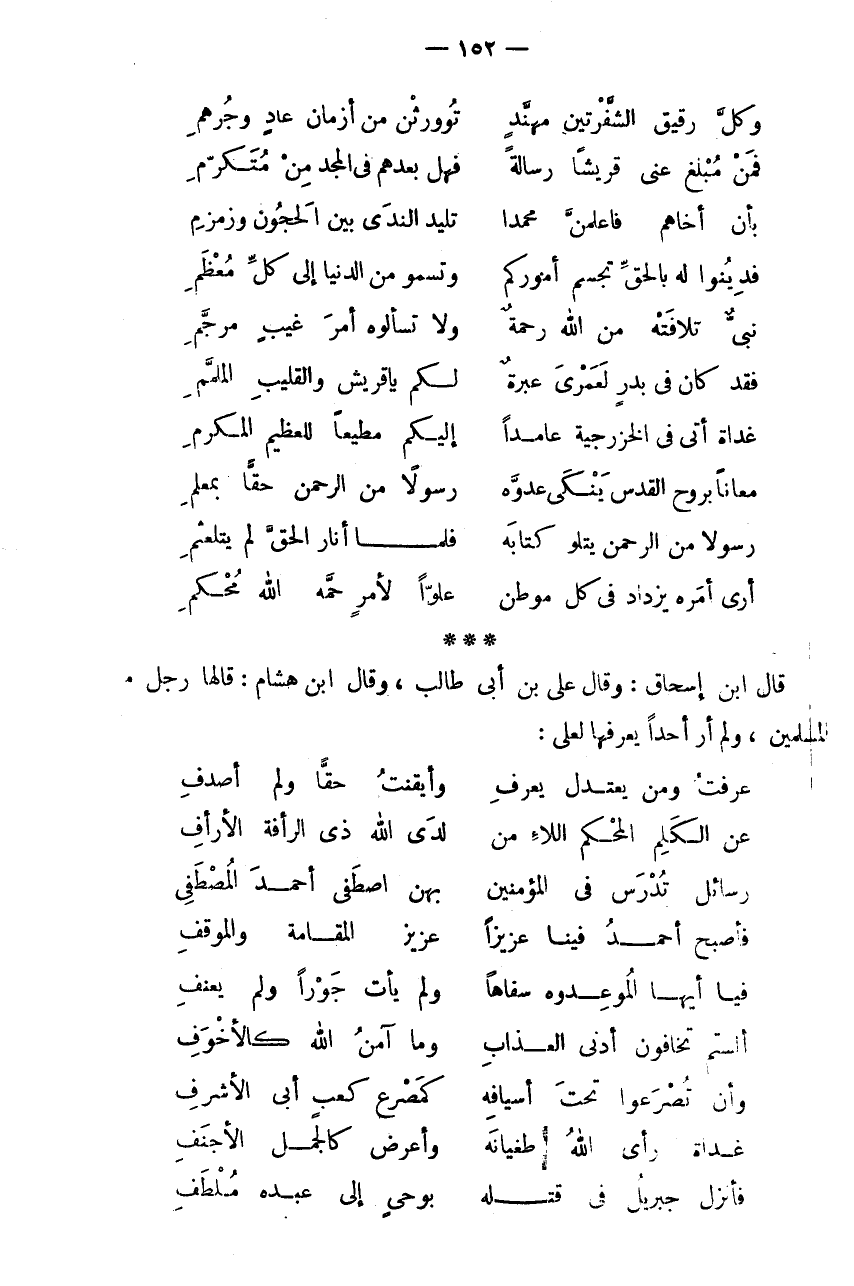 رَسُولًا مِنَ الرَّحْمَنِ يَتْلُو كِتَابَهُ * فَلَمَّا أَنَارَ الْحَقَّ لَمْ يَتَلَعْثَمِ أَرَى أَمْرَهُ يَزْدَادُ فِي كُلِّ مَوْطِنٍ * عُلُوًّا لِأَمْرٍ حَمَّهُ اللَّهُ مُحْكَمِ * * * قَالَ ابْنُ إِسْحَاقَ: وَقَالَ عَلِيُّ بْنُ أَبِي طَالب، وَقَالَ ابْن هِشَام: قَالَهَا رجل م الْمُسْلِمِينَ، وَلَمْ أَرَ أَحَدًا يَعْرِفُهَا لَعَلِيٍّ: عَرَفَتُ وَمَنْ يَعْتَدِلْ يَعْرِفِ * وَأَيْقَنْتُ حَقًّا وَلَمْ أَصْدِفِ عَن الْكَلم الْمُحكم اللاء مِنْ * لَدَى اللَّهِ ذِي الرَّأْفَةِ الْأَرْأَفِ رَسَائِلُ تُدْرَسُ فِي الْمُؤْمِنِينَ * بِهِنَّ اصْطَفَى أَحْمَدَ الْمُصْطَفِي فَأَصْبَحَ أَحْمَدُ فِينَا عَزِيزًا * عَزِيزَ الْمُقَامَةِ وَالْمَوْقِفِ فَيَا أَيُّهَا الْمُوعِدُوهُ سَفَاهًا * وَلَمْ يَأْتِ جَوْرًا وَلَمْ يَعْنُفِ أَلَسْتُمْ تَخَافُونَ أَدْنَى الْعَذَابِ * وَمَا آمِنُ اللَّهِ كَالْأَخْوَفِ وَأَنْ تُصْرَعُوا تَحْتَ أَسْيَافِهِ * كَمَصْرَعِ كَعْبٍ أَبِي الْأَشْرَفِ غَدَاةَ رَأَى اللَّهُ طُغْيَانَهُ * وَأَعْرَضَ كَالْجَمَلِ الْأَجْنَفِ فَأَنْزَلَ جِبْرِيلَ فِي قَتْلِهِ * بِوَحْيٍ إِلَى عَبْدِهِ مُلْطَفِ