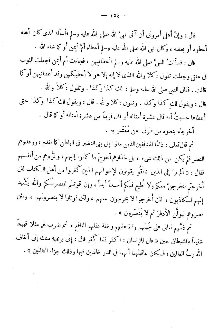 ثُمَّ قَالَ تَعَالَى: ذاما لِلْمُنَافِقين الَّذين مالوا إِلَى بنى النَّضِيرِ فِي الْبَاطِنِ كَمَا تَقَدَّمَ، وَوَعَدُوهُمُ النَّصْرَ فَلم يكن من ذَلِك شئ، بَلْ خَذَلُوهُمْ أَحْوَجَ مَا كَانُوا إِلَيْهِمْ، وَغَرُّوهُمْ مِنْ أَنْفُسِهِمْ فَقَالَ: " أَلَمْ تَرَ إِلَى الَّذِينَ نافقو يَقُولُونَ لِإِخْوَانِهِمُ الَّذِينَ كَفَرُوا مِنْ أَهْلِ الْكِتَابِ لَئِنْ أُخْرِجْتُمْ لَنَخْرُجَنَّ مَعَكُمْ وَلَا نُطِيعُ فِيكُمْ أَحَدًا أَبَدًا، وَإِنْ قُوتِلْتُمْ لَنَنْصُرَنَّكُمْ وَاللَّهُ يَشْهَدُ إِنَّهُمْ لَكَاذِبُونَ، لَئِنْ أُخْرِجُوا لَا يَخْرُجُونَ مَعَهُمْ، وَلَئِنْ قُوتِلُوا لَا يَنْصُرُونَهُمْ، وَلَئِنْ نَصَرُوهُمْ لَيُوَلُّنَّ الادبار ثمَّ لَا ينْصرُونَ ".