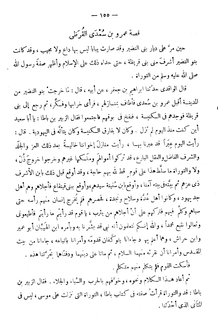 قِصَّةُ عَمْرِو بْنِ سُعْدَى الْقُرَظِيِّ حِينَ مَرَّ عَلَى دِيَارِ بَنِي النَّضِيرِ وَقَدْ صَارَتْ يَبَابًا لَيْسَ بِهَا دَاعٍ وَلَا مُجِيبٍ، وَقَدْ كَانَتْ بَنو النَّضِير أشرف منى بَنِي قُرَيْظَةَ، حَتَّى حَدَاهُ ذَلِكَ عَلَى الْإِسْلَامِ وَأَظْهَرَ صِفَةَ رَسُولِ اللَّهِ صَلَّى اللَّهُ عَلَيْهِ وَسَلَّمَ مِنَ التَّوْرَاةِ.