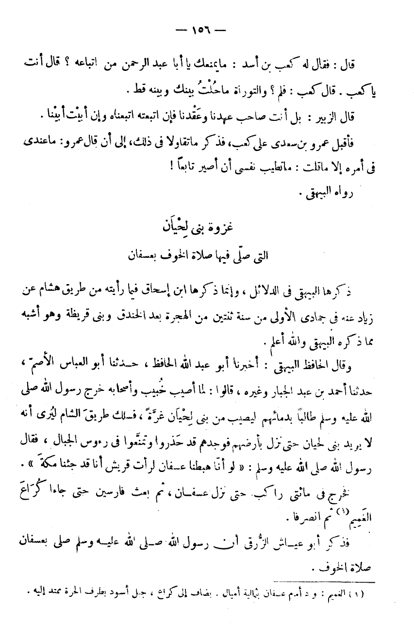 غَزْوَةَ بَنِي لِحْيَانَ الَّتِي صَلَّى فِيهَا صَلَاةَ الْخَوْف بعسفان ذَكَرَهَا الْبَيْهَقِيُّ فِي الدَّلَائِلِ، وَإِنَّمَا ذَكَرَهَا ابْنُ إِسْحَاق فِيمَا رَأَيْته من طَرِيق هِشَامٍ عَنْ زِيَادٍ عَنْهُ فِي جُمَادَى الْأُولَى من سنة ثِنْتَيْنِ مِنَ الْهِجْرَةِ بَعْدَ الْخَنْدَقِ وَبَنِي قُرَيْظَةَ وَهُوَ أَشْبَهُ مِمَّا ذَكَرَهُ الْبَيْهَقِيُّ وَاللَّهُ أَعْلَمُ.