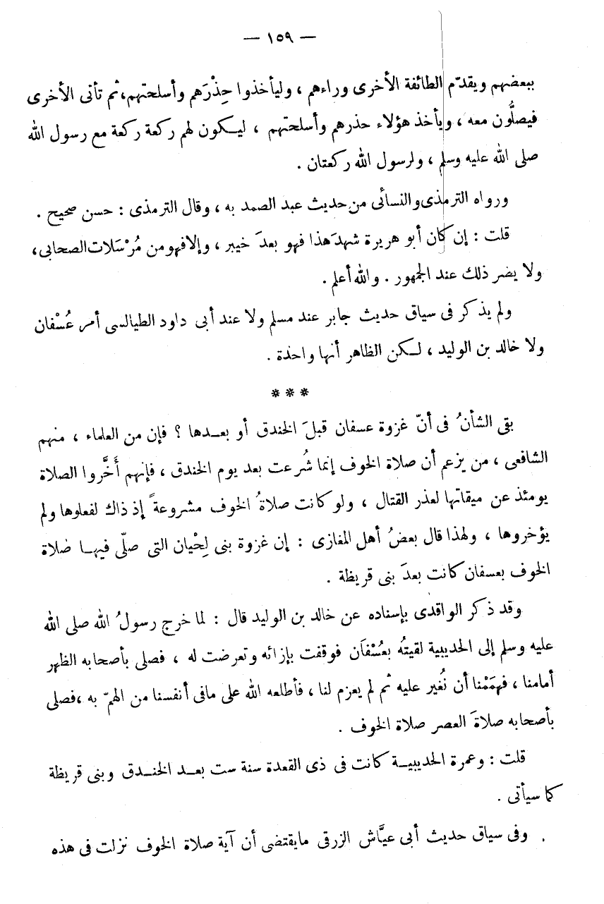 * * * بَقِيَ الشَّأْنُ فِي أَنَّ غَزْوَةَ عُسْفَانَ قَبْلَ الْخَنْدَقِ أَوْ بَعْدَهَا؟ فَإِنَّ مِنَ الْعُلَمَاءِ، مِنْهُمُ الشَّافِعِيُّ، مَنْ يَزْعُمُ أَنَّ صَلَاةَ الْخَوْفِ إِنَّمَا شُرِعَتْ بَعْدَ يَوْمِ الْخَنْدَقِ، فَإِنَّهُمْ أَخَّرُوا الصَّلَاةَ