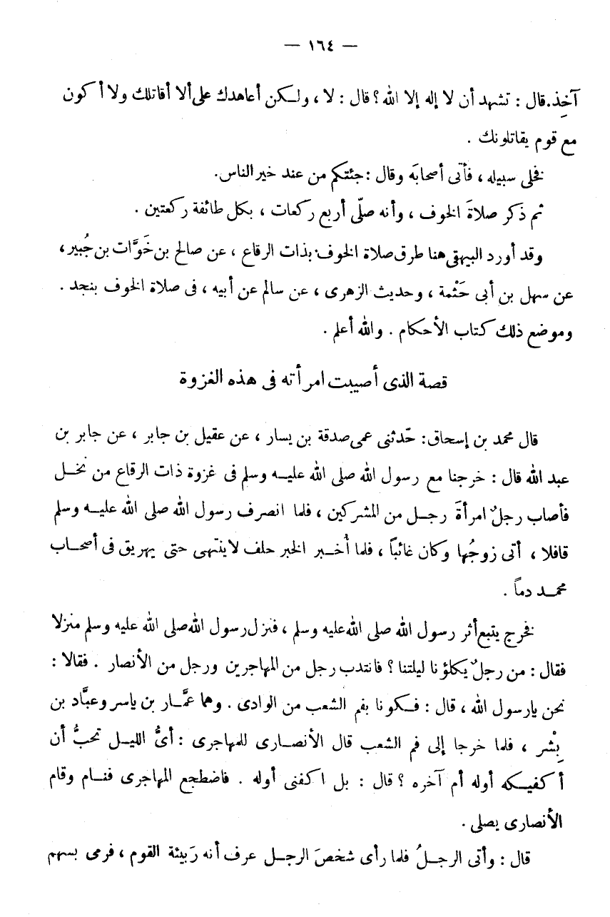 قِصَّةُ الَّذِي أُصِيبَتِ امْرَأَتُهُ فِي هَذِهِ الْغَزْوَةِ قَالَ مُحَمَّدُ بْنُ إِسْحَاقَ: حَدَّثَنِي عَمِّي صَدَقَةُ بْنُ يَسَارٍ، عَنْ عَقِيلِ بْنِ جَابِرٍ، عَنْ جَابِرِ بْنِ عَبْدِ اللَّهِ قَالَ: خَرَجْنَا مَعَ رَسُولِ اللَّهِ صَلَّى اللَّهُ عَلَيْهِ وَسَلَّمَ فِي غَزْوَةِ ذَاتِ الرِّقَاعِ مِنْ نَخْلٍ فَأَصَابَ رَجُلٌ امْرَأَةَ رَجُلٍ مِنَ الْمُشْرِكِينَ، فَلَمَّا انْصَرَفَ رَسُولُ اللَّهِ صَلَّى اللَّهُ عَلَيْهِ وَسَلَّمَ قَافِلًا، أَتَى زَوْجُهَا وَكَانَ غَائِبًا، فَلَمَّا أُخْبِرَ الْخَبَرَ حَلَفَ لَا يَنْتَهِي حَتَّى يُهَرِيقَ فِي أَصْحَابِ