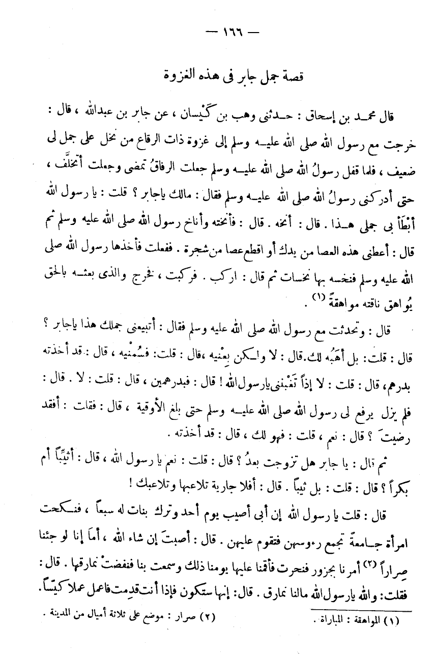 قِصَّةُ جَمَلِ جَابِرٍ فِي هَذِهِ الْغَزْوَةِ قَالَ مُحَمَّدُ بْنُ إِسْحَاقَ: حَدَّثَنِي وَهْبُ بْنُ كَيْسَانَ، عَنْ جَابِرِ بْنِ عَبْدِ اللَّهِ، قَالَ: خَرَجْتُ مَعَ رَسُولِ اللَّهِ صَلَّى اللَّهُ عَلَيْهِ وَسَلَّمَ إِلَى غَزْوَةِ ذَاتِ الرِّقَاعِ مِنْ نَخْلٍ عَلَى جَمَلٍ لِي ضَعِيفٍ، فَلَمَّا قَفَلَ رَسُولُ اللَّهِ صَلَّى اللَّهُ عَلَيْهِ وَسَلَّمَ جَعَلَتِ الرِّفَاقُ تَمْضِي وَجَعَلْتُ أَتَخَلَّفُ، حَتَّى أَدْرَكَنِي رَسُولُ اللَّهِ صَلَّى اللَّهُ عَلَيْهِ وَسَلَّمَ فَقَالَ: مَالك يَا جَابِرُ؟ قُلْتُ: يَا رَسُولَ اللَّهِ أَبْطَأَ بِي جَمَلِي هَذَا.