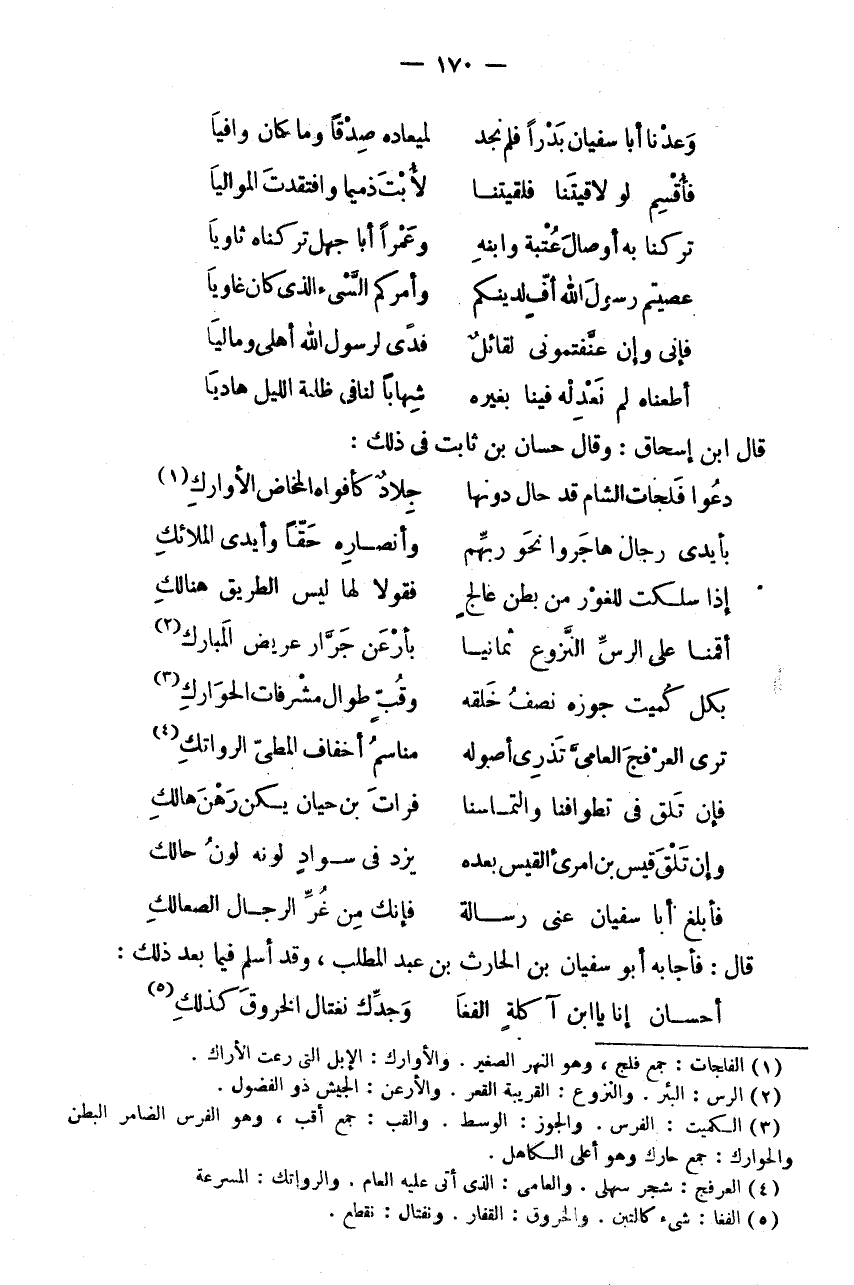 تَرَكْنَا بِهِ أَوْصَالَ عُتْبَةَ وَابْنِهِ * وَعَمْرًا أَبَا جَهْلٍ تَرَكْنَاهُ ثَاوِيَا عَصَيْتُمْ رَسُولَ اللَّهِ أُفٍّ لِدِينِكُمْ * وَأَمْرِكُمُ السئ الَّذِي كَانَ غَاوِيَا فَإِنِّي وَإِنْ عَنَّفْتُمُونِي لَقَائِلٌ * فِدًى لِرَسُولِ اللَّهِ أَهْلِي وَمَالِيَا أَطَعْنَاهُ لَمْ نعد لَهُ فِينَا بِغَيْرِهِ * شِهَابًا لَنَا فِي ظُلْمَةِ اللَّيْلِ هَادِيَا قَالَ ابْنُ إِسْحَاقَ: وَقَالَ حَسَّانُ بْنُ ثَابِتٍ فِي ذَلِكَ: دَعُوا فَلَجَاتِ الشَّامِ قَدْ حَالَ دُونَهَا * جِلَادٌ كَأَفْوَاهِ الْمَخَاضِ الْأَوَارِكِ (1) بِأَيْدِي رجال هَاجرُوا نَحْو رَبهم * وأنصاره حَقًا وأيدي الملائك إِذا سلكت للغور من بطن عالج * فَقُولَا لَهَا لَيْسَ الطَّرِيقُ هُنَالِكِ أَقَمْنَا عَلَى الرَّسِّ النَّزُوعِ ثَمَانِيًا * بِأَرْعَنَ جَرَّارٍ عَرِيضِ الْمَبَارِكِ (2) بِكُلِّ كُمَيْتٍ جَوْزُهُ نِصْفُ خَلْقِهِ * وَقُبٍّ طِوَالٍ مُشْرِفَاتِ الْحَوَارِكِ (3) تَرَى الْعَرْفَجَ الْعَامِيَّ تَذْرِي أُصُولَهُ * مَنَاسِمُ أَخْفَافِ الْمَطِيِّ الرَّوَاتِكِ (4) فَإِنْ تَلْقَ فِي تَطْوَافِنَا وَالْتِمَاسِنَا * فُرَاتَ بْنَ حَيَّانٍ يَكُنْ رَهْنَ هَالِكِ وَإِنْ تَلْقَ قَيْسَ بْنَ امْرِئِ الْقَيْسِ بَعْدَهُ * يُزَدْ فِي سَوَادِ لَوْنِهِ لَوْنُ حَالِكِ فَأَبْلِغْ أَبَا سُفْيَانَ عَنِّي رِسَالَةً * فَإِنَّكَ مِنْ غُرِّ الرِّجَالِ الصَّعَالِكِ قَالَ: فَأَجَابَهُ أَبُو سُفْيَانَ بْنُ الْحَارِثِ بْنِ عَبْدِ الْمُطَّلِبِ، وَقَدْ أَسْلَمَ فِيمَا بَعْدَ ذَلِكَ: أَحَسَّانُ إِنَّا يَا ابْنَ آكِلَة الفغا * وَجدك نغتال الخروق كَذَلِك (5)