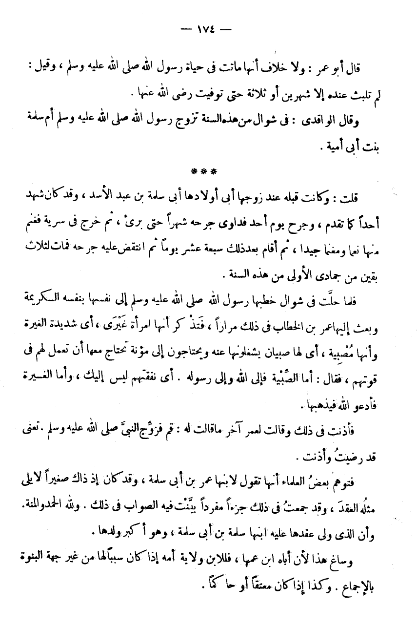 * * * قُلْتُ: وَكَانَتْ قَبْلَهُ عِنْدَ زَوْجِهَا أَبِي أَوْلَادِهَا أَبِي سَلَمَةَ بن عبد الاسد، وَقد كَانَ شهد أحدا كَمَا تَقَدَّمَ، وَجُرِحَ يَوْمَ أُحُدٍ فَدَاوَى جُرْحَهُ شهرا حَتَّى برِئ، ثُمَّ خَرَجَ فِي سَرِيَّةٍ فَغَنِمَ مِنْهَا نَعَمًا وَمَغْنَمًا جَيِّدًا، ثُمَّ أَقَامَ بَعْدَ ذَلِكَ سَبْعَةَ عَشَرَ يَوْمًا ثُمَّ انْتَقَضَ عَلَيْهِ جُرْحَهُ فَمَاتَ لِثَلَاثٍ بَقِينَ مِنْ جُمَادَى الْأُولَى مِنْ هَذِهِ السَّنَةِ.