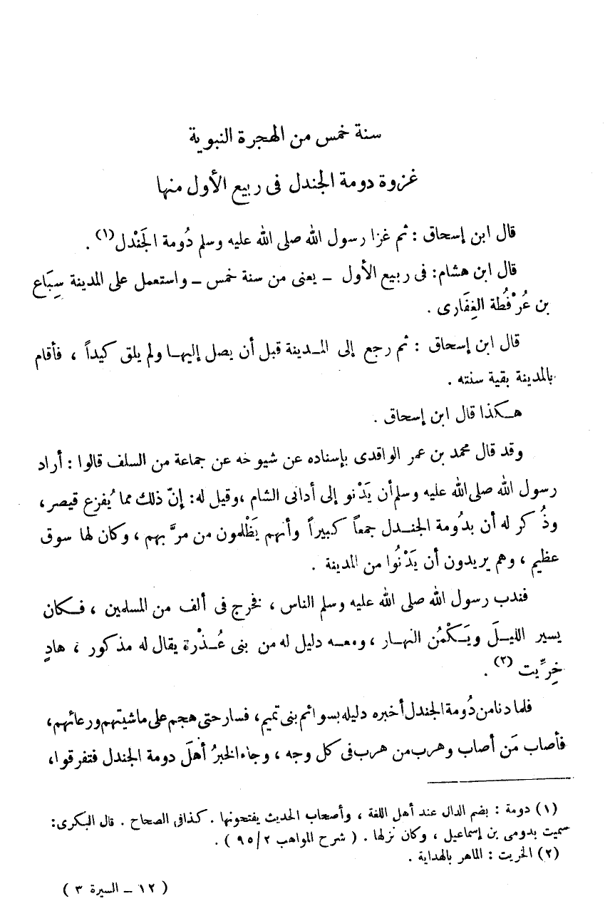 سَنَةُ خَمْسٍ مِنَ الْهِجْرَةِ النَّبَوِيَّةِ غَزْوَةُ دَوْمَةِ الْجَنْدَلِ فِي رَبِيعٍ الْأَوَّلِ مِنْهَا قَالَ ابْنُ إِسْحَاقَ: ثُمَّ غَزَا رَسُولُ اللَّهِ صَلَّى اللَّهُ عَلَيْهِ وَسَلَّمَ دَوْمَةَ الْجَنْدَلِ (1) .