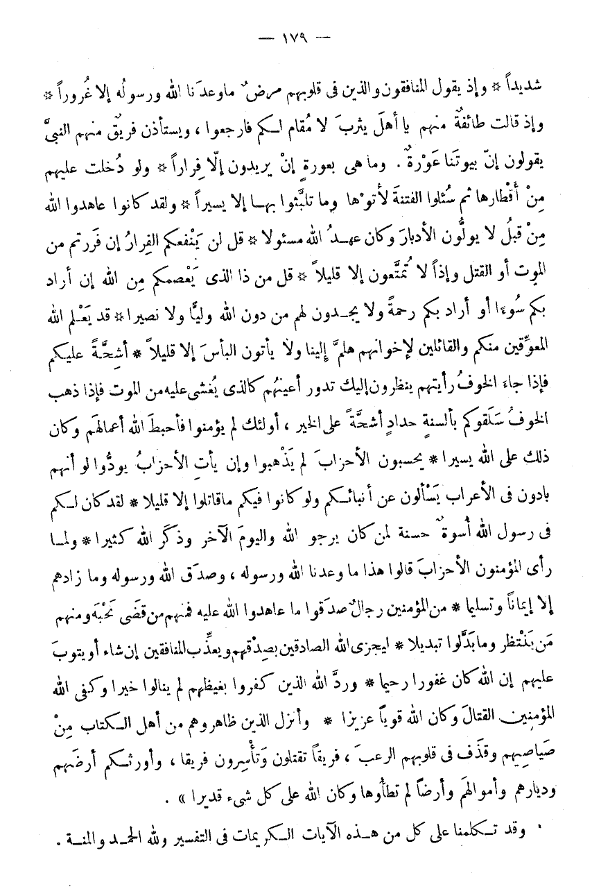 بِكُمْ سُوءًا أَوْ أَرَادَ بِكُمْ رَحْمَةً وَلَا يَجِدُونَ لَهُمْ مِنْ دُونِ اللَّهِ وَلِيًّا وَلَا نَصِيرًا * قَدْ يَعْلَمُ اللَّهُ الْمُعَوِّقِينَ مِنْكُمْ وَالْقَائِلِينَ لِإِخْوَانِهِمْ هَلُمَّ إِلَيْنَا وَلَا يَأْتُونَ الْبَأْسَ إِلَّا قَلِيلًا * أَشِحَّةً عَلَيْكُمْ فَإِذَا جَاءَ الْخَوْفُ رَأَيْتَهُمْ يَنْظُرُونَ إِلَيْكَ تَدُورُ أَعْيُنُهُمْ كَالَّذِي يُغْشَى عَلَيْهِ مِنَ الْمَوْتِ فَإِذَا ذَهَبَ الْخَوْفُ سَلَقُوكُمْ بِأَلْسِنَةٍ حِدَادٍ أَشِحَّةً عَلَى الْخَيْرِ، أُولَئِكَ لَمْ يُؤْمِنُوا فَأَحْبَطَ اللَّهُ أَعْمَالَهُمْ وَكَانَ ذَلِكَ عَلَى اللَّهِ يَسِيرًا * يَحْسَبُونَ الْأَحْزَابَ لَمْ يَذْهَبُوا وَإِنْ يَأْتِ الْأَحْزَابُ يَوَدُّوا لَوْ أَنَّهُمْ بَادُونَ فِي الْأَعْرَابِ يَسْأَلُونَ عَنْ أَنْبَائِكُمْ وَلَوْ كَانُوا فِيكُمْ مَا قَاتَلُوا إِلَّا قَلِيلًا * لَقَدْ كَانَ لَكُمْ فِي رَسُولِ اللَّهِ أُسْوَةٌ حَسَنَةٌ لِمَنْ كَانَ يَرْجُو اللَّهَ وَالْيَوْمَ الْآخِرَ وَذَكَرَ اللَّهَ كَثِيرًا * وَلَمَّا رَأَى الْمُؤْمِنُونَ الْأَحْزَابَ قَالُوا هَذَا مَا وَعَدَنَا اللَّهُ وَرَسُولُهُ، وَصَدَقَ اللَّهُ وَرَسُولُهُ وَمَا زَادَهُمْ إِلَّا إِيمَانًا وَتَسْلِيمًا * مِنَ الْمُؤْمِنِينَ رِجَالٌ صَدَقُوا مَا عَاهَدُوا اللَّهَ عَلَيْهِ فَمِنْهُمْ مَنْ قَضَى نَحْبَهُ وَمِنْهُمْ مَنْ يَنْتَظِرُ وَمَا بَدَّلُوا تَبْدِيلًا * لِيَجْزِيَ اللَّهُ الصَّادِقِينَ بِصِدْقِهِمْ وَيُعَذِّبَ الْمُنَافِقِينَ إِنْ شَاءَ أَوْ يَتُوبَ عَلَيْهِمْ إِنَّ اللَّهَ كَانَ غَفُورًا رَحِيمًا * وَرَدَّ اللَّهُ الَّذِينَ كَفَرُوا بِغَيْظِهِمْ لَمْ يَنَالُوا خَيْرًا وَكَفَى اللَّهُ الْمُؤْمِنِينَ الْقِتَالَ وَكَانَ اللَّهُ قَوِيًّا عَزِيزًا * وَأَنْزَلَ الَّذِينَ ظَاهَرُوهُمْ مِنْ أَهْلِ الْكِتَابِ مِنْ صَيَاصِيهِمْ وَقَذَفَ فِي قُلُوبِهِمُ الرُّعْبَ، فَرِيقًا تَقْتُلُونَ وَتَأْسِرُونَ فَرِيقًا، وَأَوْرَثَكُمْ أَرضهم وديارهم وَأَمْوَالهمْ وأرضا لم تطأوها وَكَانَ الله على كل شئ قَدِيرًا ".