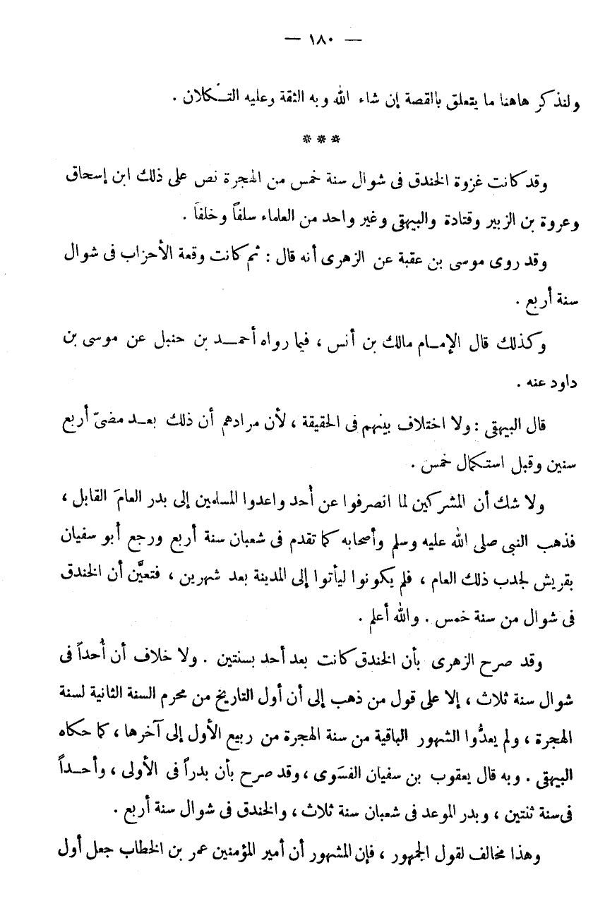* * * وَقَدْ كَانَتْ غَزْوَةُ الْخَنْدَقِ فِي شَوَّالٍ سَنَةَ خَمْسٍ مِنَ الْهِجْرَةِ نَصَّ عَلَى ذَلِكَ ابْنُ إِسْحَاقَ وَعُرْوَةُ بْنُ الزُّبَيْرِ وقَتَادَةُ والْبَيْهَقِيُّ وَغَيْرُ وَاحِدٍ مِنَ الْعُلَمَاءِ سَلَفًا وَخَلَفًا.