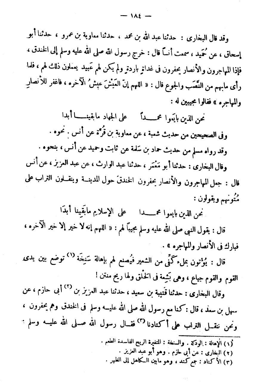 وَقَدْ قَالَ الْبُخَارِيُّ: حَدَّثَنَا عَبْدُ اللَّهِ بْنُ مُحَمَّدِ، حَدَّثَنَا مُعَاوِيَةُ بْنُ عَمْرٍو، حَدَّثَنَا أَبُو إِسْحَاقَ، عَنْ حُمَيْدٍ، سَمِعْتُ أَنَسًا قَالَ: خَرَجَ رَسُولُ اللَّهِ صَلَّى اللَّهُ عَلَيْهِ وَسَلَّمَ إِلَى الْخَنْدَقِ، فَإِذَا الْمُهَاجِرُونَ وَالْأَنْصَارُ يَحْفِرُونَ فِي غَدَاةٍ بَارِدَةٍ وَلَمْ يَكُنْ لَهُمْ عَبِيدٌ يَعْمَلُونَ ذَلِكَ لَهُمْ، فَلَمَّا رَأَى مَا بِهِمْ مِنَ النَّصَبِ وَالْجُوعِ قَالَ: " اللَّهُمَّ إِنَّ الْعَيْشَ عَيْشُ الْآخِرَةِ، فَاغْفِرْ لِلْأَنْصَارِ وَالْمُهَاجِرَهْ " فَقَالُوا مُجِيبِينَ لَهُ: نَحْنُ الَّذِينَ بَايَعُوا مُحَمَّدًا * عَلَى الْجِهَادِ مَا بَقِينَا أَبَدَا