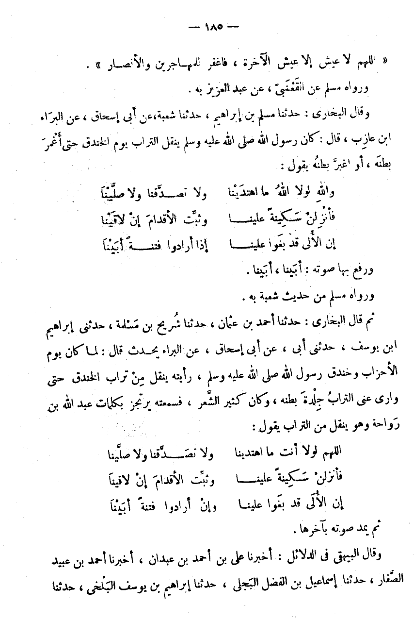 ثُمَّ قَالَ الْبُخَارِيُّ: حَدَّثَنَا أَحْمَدُ بْنُ عُثْمَانَ، حَدثنَا شُرَيْح بن مسلمة، حَدَّثَنى إِبْرَاهِيم ابْن يُوسُفَ، حَدَّثَنِي أَبِي، عَنْ أَبِي إِسْحَاقَ، عَنِ الْبَرَاءِ يُحَدِّثُ قَالَ: لَمَّا كَانَ يَوْمُ الْأَحْزَابِ وَخَنْدَقَ رَسُولُ اللَّهِ صَلَّى اللَّهُ عَلَيْهِ وَسَلَّمَ، رَأَيْتُهُ يَنْقُلُ مِنْ تُرَابِ الْخَنْدَقِ حَتَّى وَارَى عَنِّي التُّرَابُ جِلْدَةَ بَطْنِهِ، وَكَانَ كَثِيرَ الشِّعْرِ، فَسَمِعْتُهُ يَرْتَجِزُ بِكَلِمَاتِ عَبْدِ اللَّهِ بْنِ رَوَاحَةَ وَهُوَ يَنْقُلُ مِنَ التُّرَابِ يَقُولُ: اللَّهُمَّ لَوْلَا أَنْتَ مَا اهْتَدَيْنَا * وَلَا تَصَدَّقْنَا وَلَا صَلَّيْنَا فَأَنْزِلَنْ سَكِينَةً عَلَيْنَا * وَثَبِّتِ الْأَقْدَامَ إِنْ لَاقَيْنَا إِنَّ الْأُلَى قَدْ بَغَوْا عَلَيْنَا * وَإِنْ أَرَادُوا فِتْنَةً أَبَيْنَا ثُمَّ يُمَدُّ صَوْتَهُ بِآخِرِهَا.
