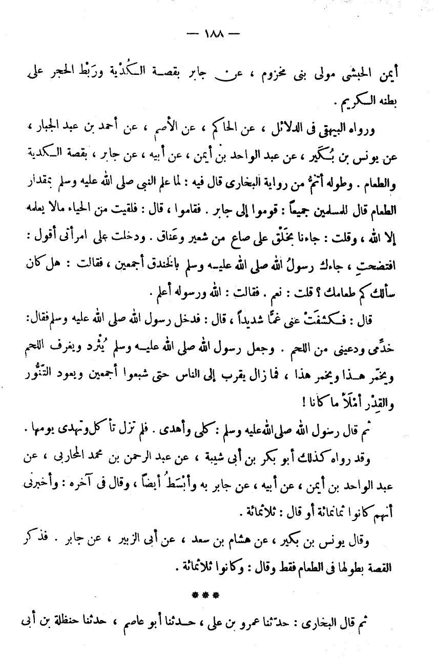 أَيْمَنَ الْحَبَشِيِّ مَوْلَى بَنِي مَخْزُومٍ، عَنْ جَابِرٍ بِقِصَّةِ الْكُدْيَةِ وَرَبْطِ الْحَجَرِ عَلَى بَطْنِهِ الْكَرِيمِ.