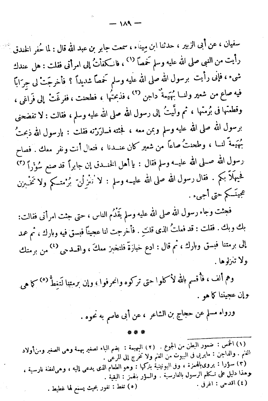 سُفْيَان، عَن أَبى الزبير، حَدثنَا ابْن مِينَاءَ، سَمِعْتُ جَابِرَ بْنَ عَبْدِ اللَّهِ قَالَ: لَمَّا حُفِرَ الْخَنْدَقُ رَأَيْتُ مِنَ النَّبِيِّ صَلَّى اللَّهُ عَلَيْهِ وَسَلَّمَ خَمَصًا (1) ، فَانْكَفَأْتُ إِلَى امْرَأَتِي فَقلت: هَل عنْدك شئ، فَإِنِّي رَأَيْتُ بِرَسُولِ اللَّهِ صَلَّى اللَّهُ عَلَيْهِ وَسلم خمصا شَدِيدا؟ فأخرجت لى جِرَابًا فِيهِ صَاعٌ مِنْ شَعِيرٍ وَلَنَا بُهَيْمَةٌ دَاجِن (2) ، فذبحتها، فَطحنت، فَفَرَغَتْ إِلَى فَرَاغِي، وَقَطَّعْتُهَا فِي بُرْمَتِهَا، ثُمَّ وَلَّيْتُ إِلَى رَسُولِ اللَّهِ صَلَّى اللَّهُ عَلَيْهِ وَسَلَّمَ، فَقَالَتْ: لَا تَفْضَحْنِي
