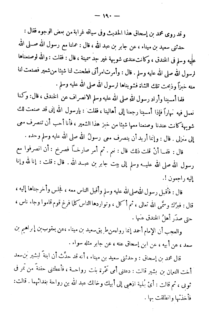 وَقَدْ رَوَى مُحَمَّدُ بْنُ إِسْحَاقَ هَذَا الْحَدِيثَ وَفِي سِيَاقِهِ غَرَابَةٌ مِنْ بَعْضِ الْوُجُوهِ فَقَالَ: حَدَّثَنِي سَعِيدُ بْنُ مِينَاءَ، عَنْ جَابِرِ بْنِ عَبْدِ اللَّهِ، قَالَ: عَمِلْنَا مَعَ رَسُولِ اللَّهِ صَلَّى اللَّهُ عَلَيْهِ وَسَلَّمَ فِي الْخَنْدَقِ، وَكَانَتْ عِنْدِي شُوَيْهَةٌ غَيْرُ جِدِّ سَمِينَةٍ، قَالَ: فَقُلْتُ: وَاللَّهِ لَوْ صَنَعْنَاهَا
