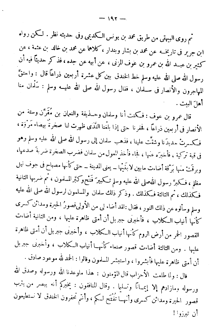 قَالَ عَمْرُو بْنُ عَوْفٍ: فَكُنْتُ أَنَا وَسَلْمَانُ وَحُذَيْفَةُ وَالنُّعْمَانُ بْنُ مُقَرِّنٍ وَسِتَّةٌ مِنَ الْأَنْصَارِ فِي أَرْبَعِينَ ذِرَاعًا، فَحَفَرْنَا حَتَّى إِذَا بَلَغْنَا النَّدَى ظَهَرَتْ لَنَا صَخْرَةٌ بَيْضَاءُ مَرْوَةٌ، فَكَسَرَتْ حَدِيدَنَا وَشَقَّتْ عَلَيْنَا، فَذَهَبَ سَلْمَانُ إِلَى رَسُولِ اللَّهِ صَلَّى اللَّهُ عَلَيْهِ وَسَلَّمَ وَهُوَ فِي قُبَّةٍ تُرْكِيَّةٍ، فَأَخْبَرَهُ عَنْهَا، فَجَاءَ فَأَخَذَ الْمِعْوَلَ مِنْ سلمَان فَضرب الصَّخْرَة ضَرْبَة صَدعهَا، وَبَرَقَتْ مِنْهَا بُرْقَةٌ أَضَاءَتْ مَا بَيْنَ لَابَتَيْهَا - يَعْنِي الْمَدِينَةَ - حَتَّى كَأَنَّهَا مِصْبَاحٌ فِي جَوْفِ لَيْلٍ مُظْلِمٍ، فَكَبَّرَ رَسُولُ اللَّهِ صَلَّى اللَّهُ عَلَيْهِ وَسَلَّمَ تَكْبِيرَ فَتْحٍ وَكَبَّرَ الْمُسْلِمُونَ، ثُمَّ ضَرَبَهَا الثَّانِيَةَ فَكَذَلِكَ، ثُمَّ الثَّالِثَةَ فَكَذَلِكَ.