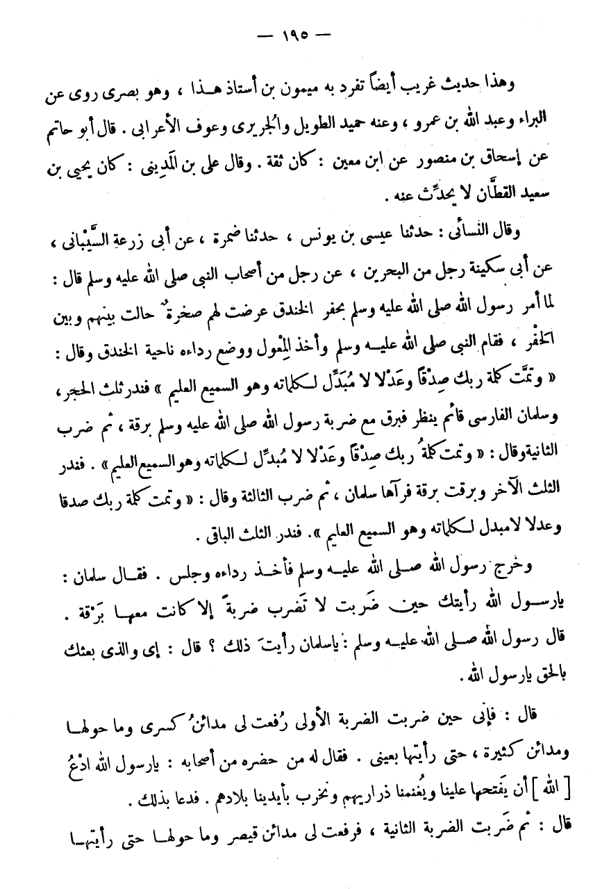 وَقَالَ النَّسَائِيُّ: حَدَّثَنَا عِيسَى بْنُ يُونُسَ، حَدَّثَنَا ضَمْرَةُ، عَنْ أَبِي زُرْعَةَ السَّيْبَانِيِّ، عَنْ أَبِي سكينَة رجل من الْبَحْرين، عَنْ رَجُلٍ مِنْ أَصْحَابِ النَّبِيِّ صَلَّى اللَّهُ عَلَيْهِ وَسَلَّمَ قَالَ: لَمَّا أَمَرَ رَسُولُ اللَّهِ صَلَّى اللَّهُ عَلَيْهِ وَسَلَّمَ بِحَفْرِ الْخَنْدَقِ عَرَضَتْ لَهُمْ صَخْرَةٌ حَالَتْ بَيْنَهُمْ وَبَيْنَ الْحَفْرِ، فَقَامَ النَّبِيُّ صَلَّى اللَّهُ عَلَيْهِ وَسَلَّمَ وَأَخَذَ الْمِعْوَلَ وَوَضَعَ رِدَاءَهُ نَاحِيَةَ الْخَنْدَقِ وَقَالَ: " وَتَمَّتْ كَلِمَةُ رَبِّكَ صِدْقًا وَعَدْلًا لَا مُبَدِّلَ لِكَلِمَاتِهِ وَهُوَ السَّمِيع الْعَلِيم " فَنَدَرَ ثُلُثُ الْحَجَرِ، وَسَلْمَانُ الْفَارِسِيُّ قَائِمٌ يَنْظُرُ فَبَرَقَ مَعَ ضَرْبَةِ رَسُولِ اللَّهِ صَلَّى اللَّهُ عَلَيْهِ وَسَلَّمَ بُرْقَةٌ، ثُمَّ ضَرَبَ الثَّانِيَةَ وَقَالَ: " وَتَمَّتْ كَلِمَةُ رَبِّكَ صِدْقًا وَعَدْلًا لَا مُبَدِّلَ لكلماته وَهُوَ السَّمِيع الْعَلِيم ".
