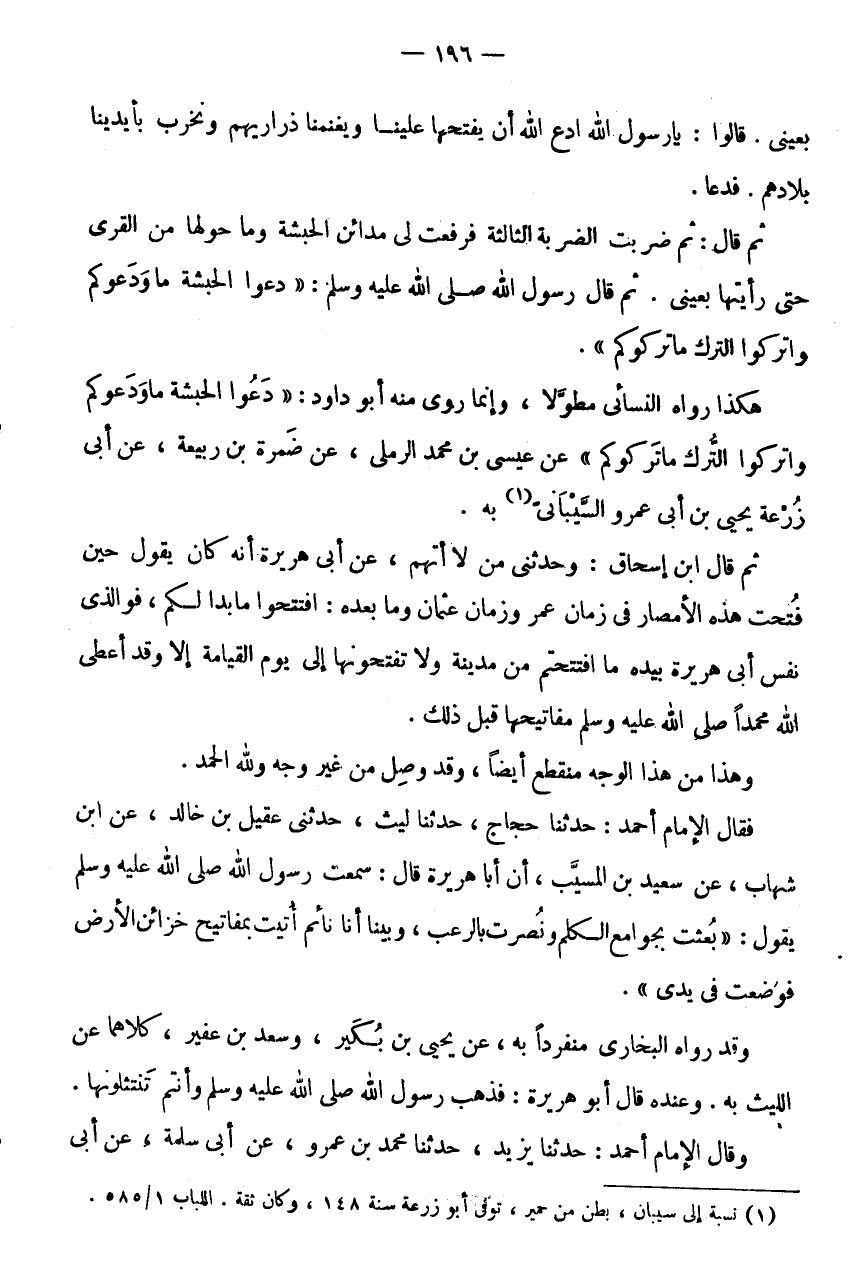 هَكَذَا رَوَاهُ النَّسَائِيُّ مُطَوَّلًا، وَإِنَّمَا رَوَى مِنْهُ أَبُو دَاوُدَ: " دَعُوُا الْحَبَشَةَ مَا وَدَعُوكُمْ وَاتْرُكُوا التُّرْكَ مَا تَرَكُوكُمْ " عَنْ عِيسَى بْنِ مُحَمَّدٍ الرَّمْلِيِّ، عَنْ ضَمْرَةَ بْنِ رَبِيعَةَ، عَنْ أَبِي زُرْعَةَ يَحْيَى بْنِ أَبِي عَمْرٍو السَّيْبَانِيِّ (1) بِهِ.