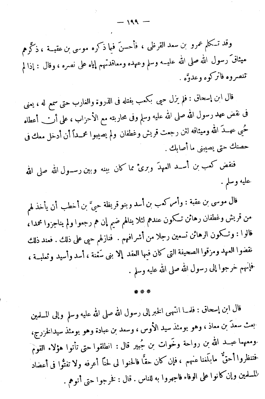 * * * قَالَ ابْنُ إِسْحَاقَ: فَلَمَّا انْتَهَى الْخَبَرُ إِلَى رَسُولِ اللَّهِ صَلَّى اللَّهُ عَلَيْهِ وَسَلَّمَ وَإِلَى الْمُسْلِمِينَ بَعَثَ سَعْدَ بْنَ مُعَاذٍ، وَهُوَ يَوْمَئِذٍ سَيِّدُ الْأَوْسِ، وَسَعْدَ بْنَ عُبَادَةَ وَهُوَ يَوْمَئِذٍ سَيِّدُ الْخَزْرَجِ، وَمَعَهُمَا عَبْدُ اللَّهِ بْنُ رَوَاحَةَ وَخَوَّاتُ بْنُ جُبَيْرٍ قَالَ: انْطَلِقُوا حَتَّى تَأْتُوا هَؤُلَاءِ الْقَوْمَ فَتَنْظُرُوا أَحَقٌّ مَا بَلَغَنَا عَنْهُمْ، فَإِنْ كَانَ حَقًّا فَالْحَنُوا لِي لَحْنًا أَعْرِفُهُ وَلَا تَفُتُّوا فِي أَعْضَادِ الْمُسْلِمِينَ وَإِنْ كَانُوا عَلَى الْوَفَاءِ فَاجْهُرُوا بِهِ لِلنَّاسِ.