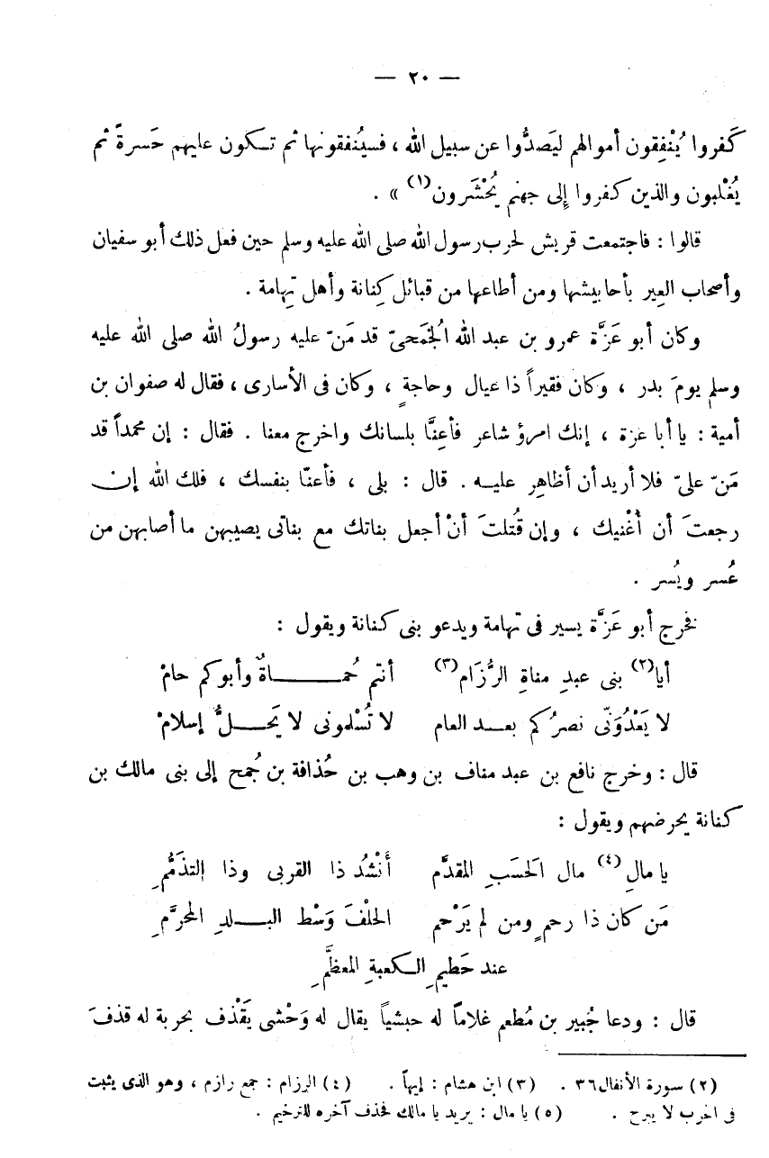فَخَرَجَ أَبُو عَزَّةَ يَسِيرُ فِي تِهَامَةَ وَيَدْعُو بَنِي كِنَانَةَ وَيَقُولُ: أَيَا (2) بَنِي عَبْدِ مَنَاةَ الرُّزَّامْ (3) * أَنْتُمْ حُمَاةٌ وَأَبُوكُمْ حَامْ لَا يَعْدُونِي نَصْرُكُمْ بَعْدَ الْعَامْ * لَا تُسَلِمُونِي لَا يَحِلُّ إِسْلَامْ قَالَ: وَخرج نَافِع بْنُ عَبْدِ مَنَافِ بْنِ وَهَبِ بْنِ حُذَافَةَ بْنِ جُمَحَ إِلَى بَنِي مَالِكِ بْنِ كِنَانَةَ يُحَرِّضُهُمْ وَيَقُولُ: يَا مَالِ (4) مَالِ الْحَسَبِ الْمُقَدَّمِ * أَنْشُدُ ذَا الْقُرْبَى وَذَا التَّذَمُّمِ مَنْ كَانَ ذَا رَحْمٍ وَمَنْ لَمْ يَرْحُمِ * الْحِلْفَ وَسْطَ الْبَلَدِ الْمُحَرَّمِ عِنْدَ حَطِيمِ الْكَعْبَةِ الْمُعَظَّمِ قَالَ: وَدَعَا جُبَيْرُ بْنُ مُطْعِمٍ غُلَامًا لَهُ حَبَشِيًّا يُقَالُ لَهُ وَحْشِيٌّ يَقْذِفُ بِحَرْبَةٍ لَهُ قَذْفَ