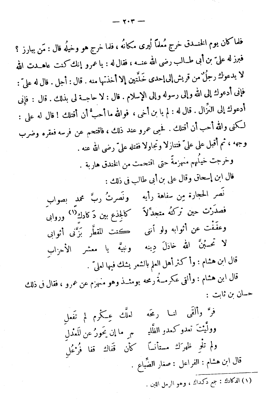 قَالَ ابْنُ هِشَامٍ: وَأَلْقَى عِكْرِمَةُ رُمْحَهُ يَوْمَئِذٍ وَهُوَ مُنْهَزِمٌ عَنْ عَمْرٍو، فَقَالَ فِي ذَلِكَ حَسَّانُ بْنُ ثَابِتٍ: فَرَّ وَأَلْقَى لَنَا رُمْحَهُ * لَعَلَّكَ عِكْرِمَ لَمْ تَفْعَلِ وَوَلَّيْتَ تَعْدُو كَعَدْوِ الظلي * م مَا إِن يحور عَن الْمعدل وَلم تلو ظَهْرَكَ مُسْتَأْنِسًا * كَأَنَّ قَفَاكَ قَفَا فُرْعُلِ قَالَ ابْن هِشَام: الفراعل: صغَار الضباع.