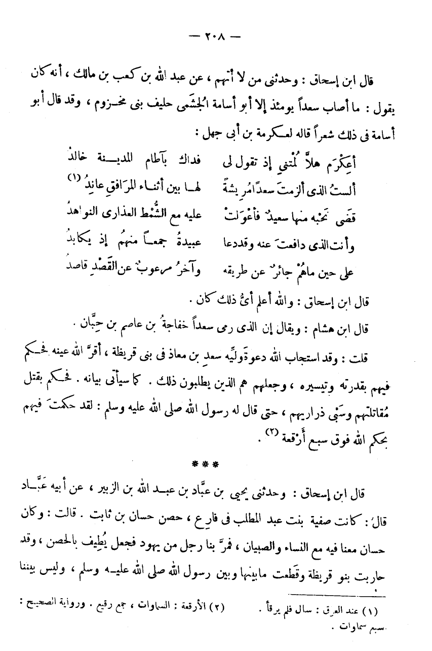 أَلَسْت الذى ألزمت سَعْدا مريشة * لَهَا بَيْنَ أَثْنَاءِ الْمَرَافِقِ عَانِدُ (1) قَضَى نَحْبَهُ مِنْهَا سُعَيْدٌ فَأَعْوَلَتْ * عَلَيْهِ مَعَ الشُّمْطِ الْعَذَارَى النَّوَاهِدُ وَأَنْتَ الَّذِي دَافَعْتَ عَنْهُ وَقَدْ دَعَا * عُبَيْدَةُ جَمْعًا مِنْهُمُ إِذْ يُكَابِدُ عَلَى حِينِ مَا هُمْ جَائِرٌ عَنْ طَرِيقِهِ * وَآخَرُ مَرْعُوبٌ عَنِ الْقَصْدِ قَاصِدُ قَالَ ابْنُ إِسْحَاقَ: وَاللَّهُ أَعْلَمُ أَيُّ ذَلِكَ كَانَ.