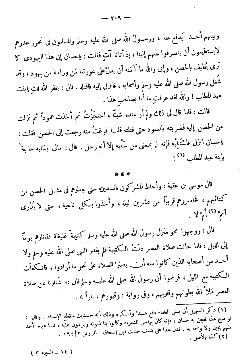 قَالَ: مالى بسلبه حَاجَة يابنة عبد الْمطلب (1) ! * * * قَالَ مُوسَى بْنُ عُقْبَةَ: وَأَحَاطَ الْمُشْرِكُونَ بِالْمُسْلِمِينَ حَتَّى جعلوهم فِي مثل الْحصن من كَتَائِبِهِمْ، فَحَاصَرُوهُمْ قَرِيبًا مِنْ عِشْرِينَ لَيْلَةً، وَأَخَذُوا بِكُل نَاحيَة، حَتَّى لَا يدرى أتم (2) أَمْ لَا.