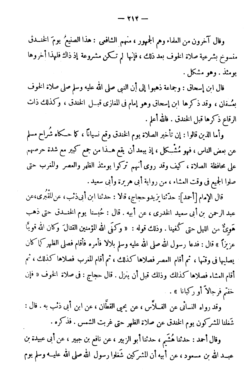 وَأَمَّا الَّذِينَ قَالُوا: إِنَّ تَأْخِيرَ الصَّلَاةِ يَوْمَ الْخَنْدَقِ وَقَعَ نِسْيَانًا، كَمَا حَكَاهُ شُرَّاحُ مُسْلِمٍ عَنْ بَعْضِ النَّاسِ، فَهُوَ مُشْكِلٌ، إِذْ يَبْعُدُ أَنْ يَقَعَ هَذَا مِنْ جَمْعٍ كَبِيرٍ مَعَ شِدَّةِ حِرْصِهِمْ على مُحَافظَة الصَّلَاةِ، كَيْفَ وَقَدْ رُوِيَ أَنَّهُمْ تَرَكُوا يَوْمَئِذٍ الظُّهْرَ وَالْعَصْرَ وَالْمَغْرِبَ حَتَّى صَلَّوُا الْجَمِيعَ فِي وَقت الْعشَاء، من رِوَايَة أَبى هُرَيْرَة وأبى سعيد.