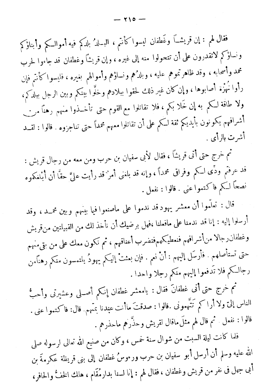 مُحَمَّدٍ وَأَصْحَابِهِ، وَقَدْ ظَاهَرْتُمُوهُمْ عَلَيْهِ، وَبَلَدُهُمْ وَنِسَاؤُهُمْ وَأَمْوَالُهُمْ بِغَيْرِهِ، فَلَيْسُوا كَأَنْتُمْ فَإِنْ رَأَوْا نُهْزَةً أَصَابُوهَا، وَإِنْ كَانَ غَيْرُ ذَلِكَ لَحِقُوا بِبِلَادِهِمْ وَخَلَّوْا بَيْنَكُمْ وَبَيْنَ الرَّجُلِ بِبَلَدِكُمْ، وَلَا طَاقَةَ لَكُمْ بِهِ إِنْ خَلَا بِكُمْ، فَلَا تُقَاتِلُوا مَعَ الْقَوْمِ حَتَّى تَأْخُذُوا مِنْهُمْ رَهْنًا مِنْ أَشْرَافِهِمْ يَكُونُونَ بِأَيْدِيكُمْ ثِقَةً لَكُمْ عَلَى أَنْ تُقَاتِلُوا مَعَهُمْ مُحَمَّدًا حَتَّى تُنَاجِزُوهُ.