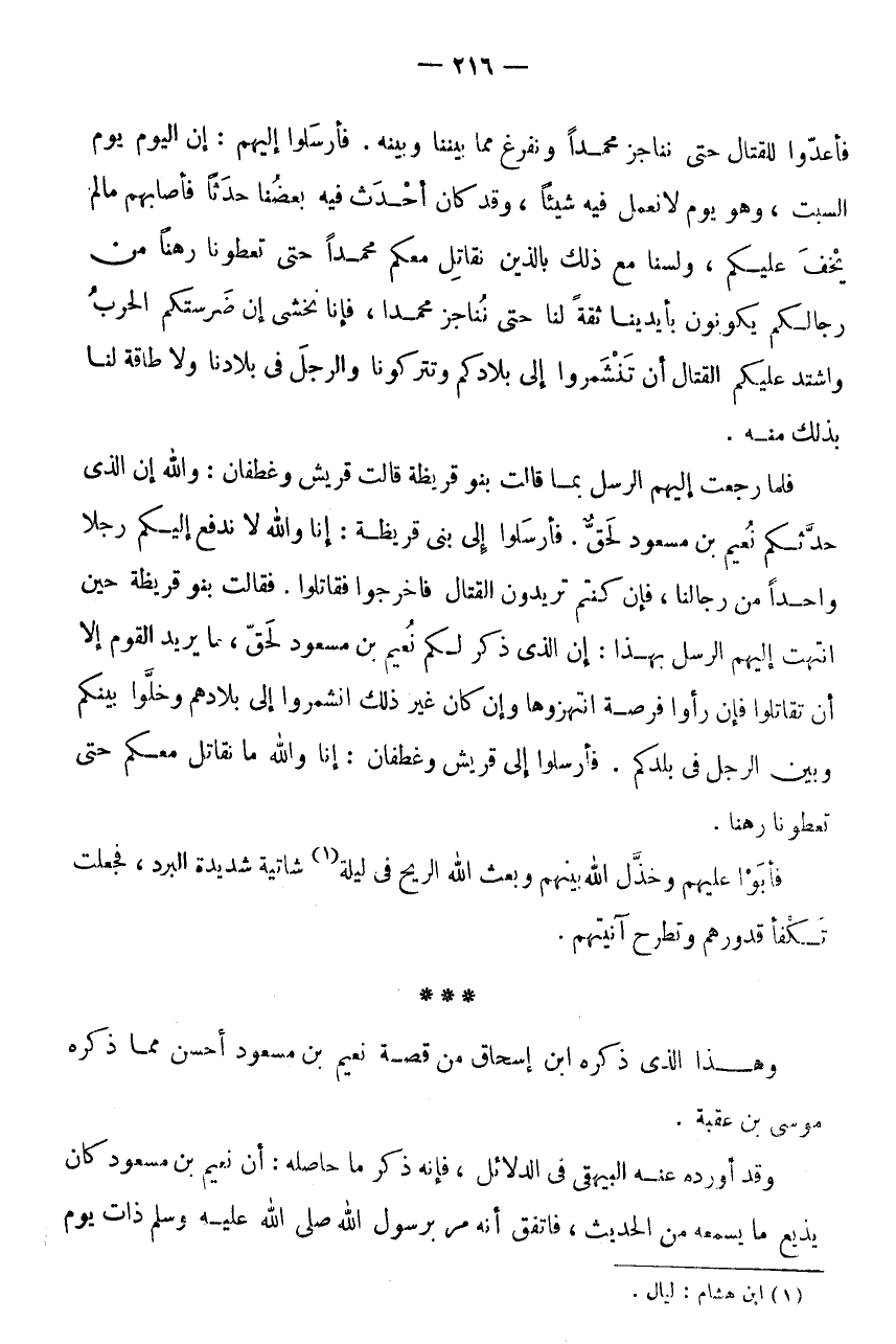 * * * وَهَذَا الَّذِي ذَكَرَهُ ابْنُ إِسْحَاقَ مِنْ قِصَّةِ نُعَيْمِ بْنِ مَسْعُودٍ أَحْسَنُ مِمَّا ذَكَرَهُ مُوسَى بْنُ عُقْبَةَ.