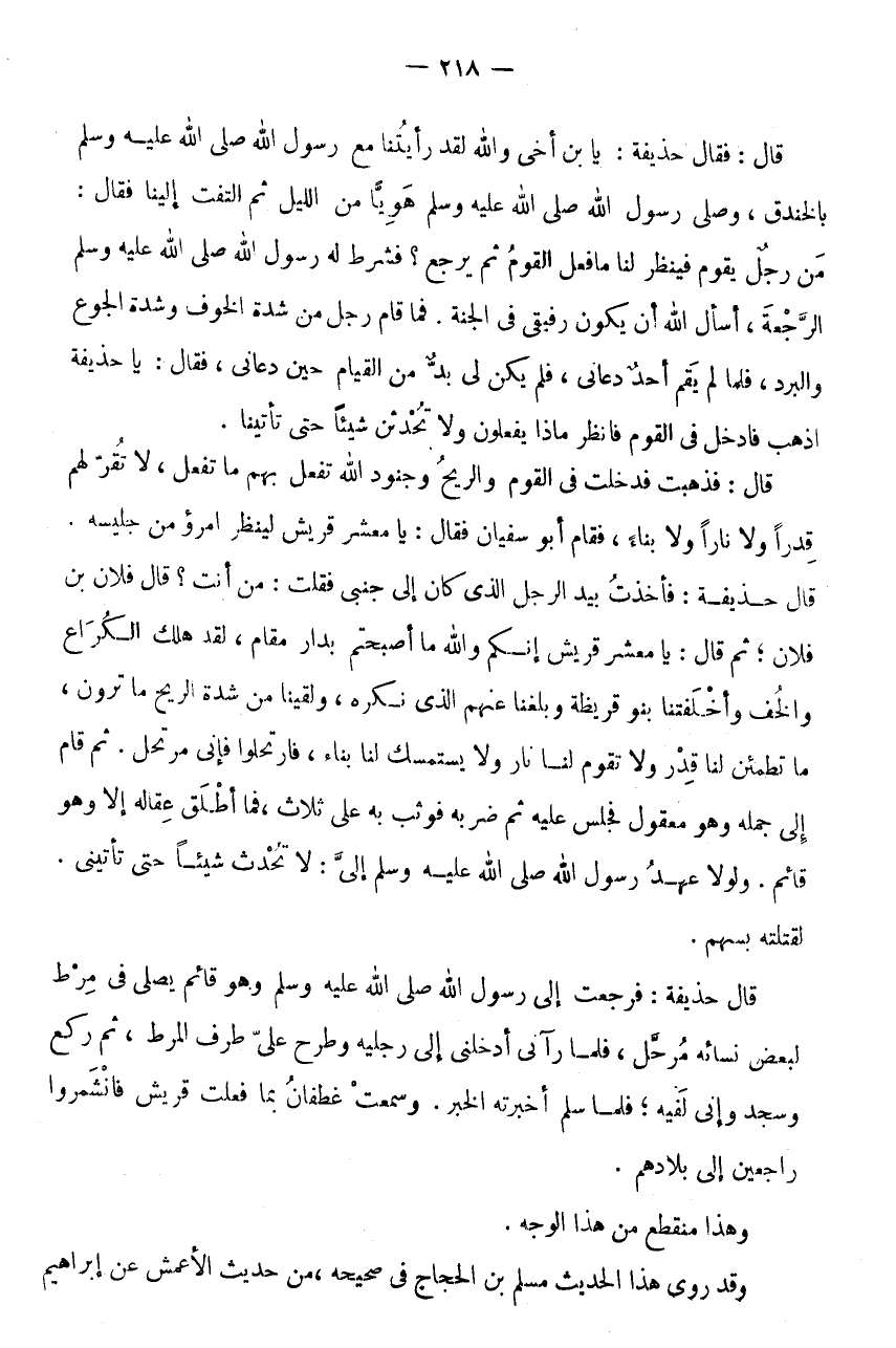 قَالَ: فَقَالَ حُذَيْفَة: يَابْنَ أَخِي وَاللَّهِ لَقَدْ رَأَيْتُنَا مَعَ رَسُولِ اللَّهِ صَلَّى اللَّهُ عَلَيْهِ وَسَلَّمَ بِالْخَنْدَقِ، وَصَلَّى رَسُولُ اللَّهِ صَلَّى اللَّهُ عَلَيْهِ وَسَلَّمَ هَوِيًّا مِنَ اللَّيْلِ ثُمَّ الْتَفَتَ إِلَيْنَا فَقَالَ: