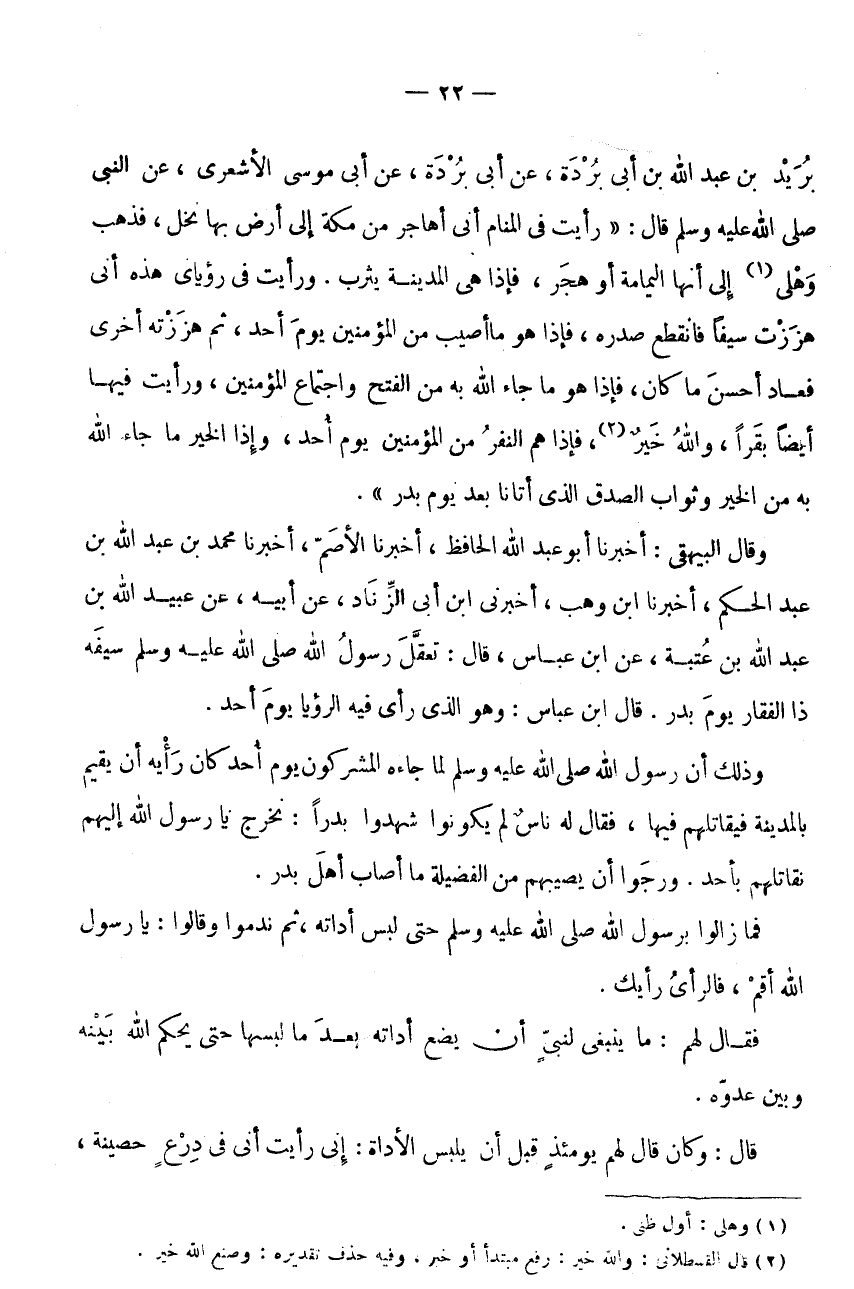 وَرَأَيْتُ فِي رُؤْيَايَ هَذِهِ أَنِّي هَزَزْتُ سَيْفًا فَانْقَطَعَ صَدْرُهُ، فَإِذَا هُوَ مَا أُصِيبَ مِنَ الْمُؤْمِنِينَ يَوْمَ أُحُدٍ، ثُمَّ هَزَزْتُهُ أُخْرَى فَعَادَ أَحْسَنَ مَا كَانَ، فَإِذَا هُوَ مَا جَاءَ اللَّهُ بِهِ مِنَ الْفَتْحِ وَاجْتِمَاعِ الْمُؤْمِنِينَ، وَرَأَيْتُ فِيهَا أَيْضًا بَقَرًا، وَاللَّهُ خَيْرٌ (2) ، فَإِذَا هُمُ النَّفَرُ مِنَ الْمُؤْمِنِينَ يَوْمَ أُحُدٍ، وَإِذَا الْخَيْرُ مَا جَاءَ اللَّهُ بِهِ مِنَ الْخَيْرِ وَثَوَابِ الصِّدْقِ الَّذِي أَتَانَا بَعْدَ يَوْمِ بَدْرٍ ".