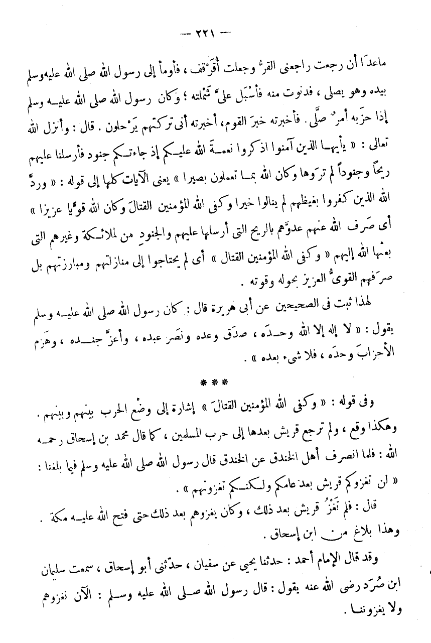 * * * وَفِي قَوْلِهِ: " وَكَفَى اللَّهُ الْمُؤْمِنِينَ الْقِتَالَ " إِشَارَةٌ إِلَى وَضْعِ الْحَرْبِ بَيْنَهُمْ وَبَيْنَهُمْ.