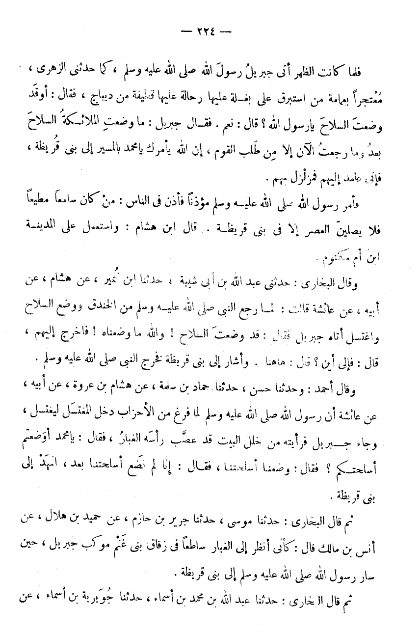 ثُمَّ قَالَ الْبُخَارِيُّ: حَدَّثَنَا مُوسَى، حَدَّثَنَا جَرِيرُ بْنُ حَازِمٍ، عَنْ حُمَيْدِ بْنِ هِلَالٍ، عَنْ أَنَسِ بْنِ مَالِكٍ قَالَ: كَأَنِّي أَنْظُرُ إِلَى الْغُبَارِ سَاطِعًا فِي زُقَاقِ بَنِي غَنْمٍ مَوْكِبَ جِبْرِيلَ، حِينَ سَارَ رَسُولُ اللَّهِ صَلَّى اللَّهُ عَلَيْهِ وَسَلَّمَ إِلَى بَنِي قُرَيْظَةَ.