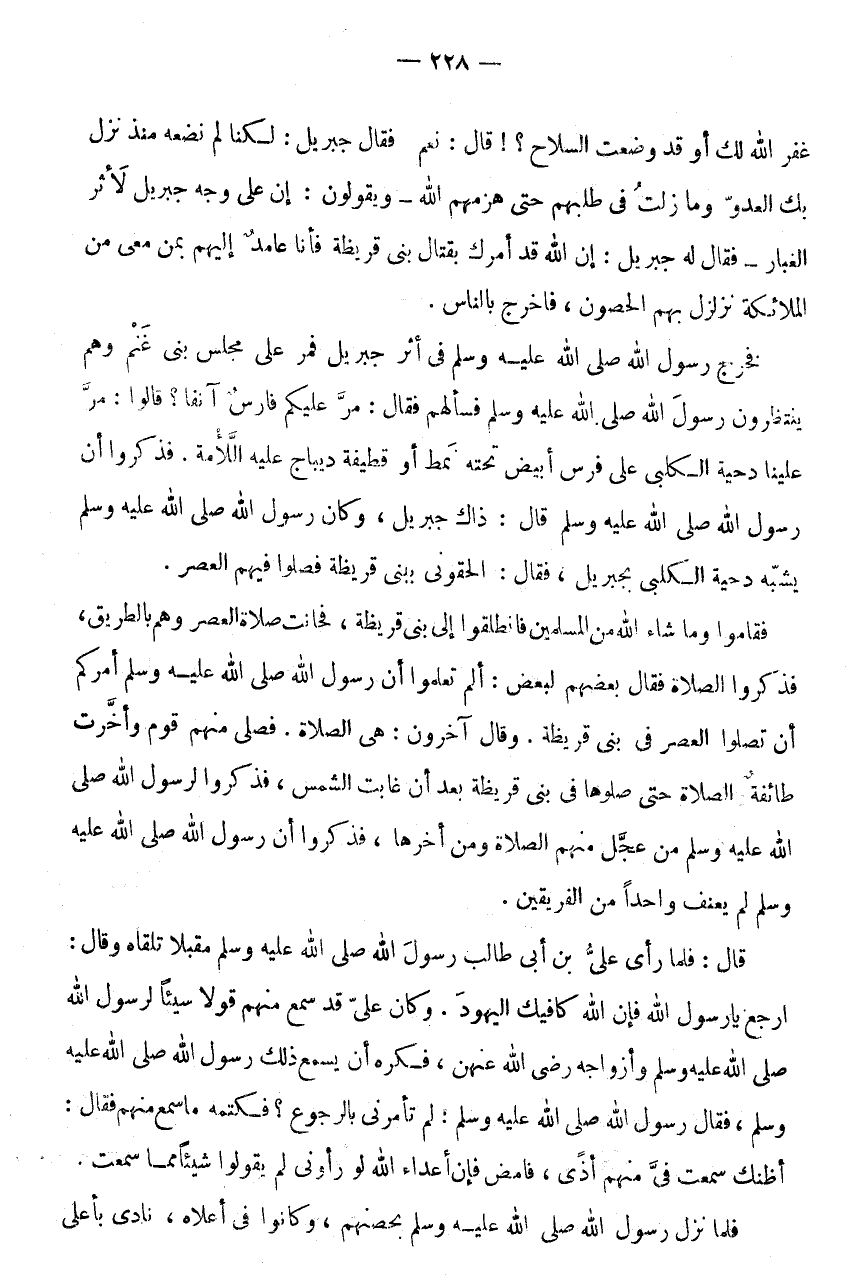 غفر الله لَك أَو قد وَضَعْتَ السِّلَاحَ؟ ! قَالَ: نَعَمْ فَقَالَ جِبْرِيلُ: لَكِنَّا لَمْ نَضَعْهُ مُنْذُ نَزَلَ بِكَ الْعَدُوُّ وَمَا زِلْتُ فِي طَلَبِهِمْ حَتَّى هَزَمَهُمُ اللَّهُ - وَيَقُولُونَ: إِنَّ عَلَى وَجْهِ جِبْرِيلَ لَأَثَرَ الْغُبَارِ - فَقَالَ لَهُ جِبْرِيلُ: إِنَّ اللَّهَ قَدْ أَمَرَكَ بِقِتَالِ بَنِي قُرَيْظَةَ فَأَنَا عَامِدٌ إِلَيْهِمْ بِمَنْ مَعِي من الْمَلَائِكَة نزلزل بِهِمُ الْحُصُونَ، فَاخْرُجْ بِالنَّاسِ.