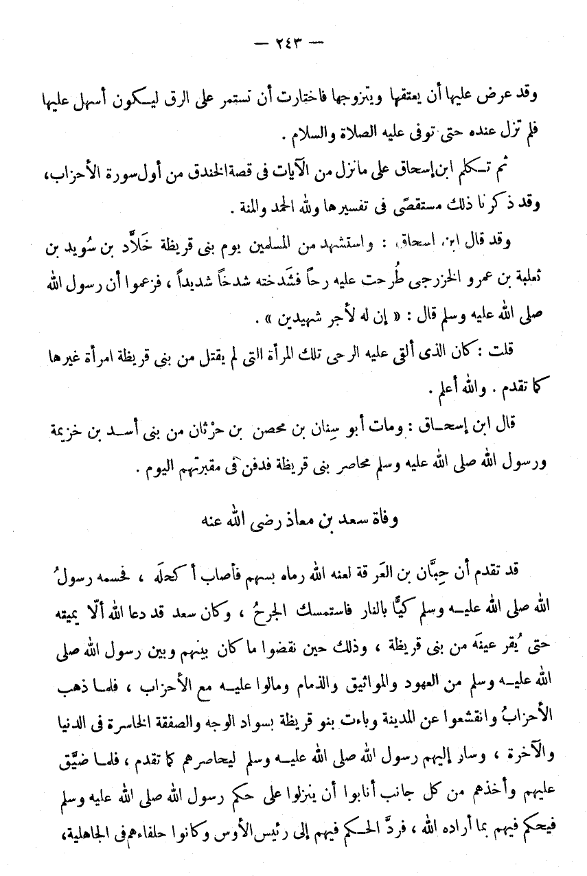 وَفَاة سعد بن معَاذ رَضِيَ اللَّهُ عَنْهُ قَدْ تَقَدَّمَ أَنَّ حِبَّانَ بْنَ الْعَرِقَةِ لَعَنَهُ اللَّهُ رَمَاهُ بِسَهْمٍ فَأَصَابَ أَكْحَلَهُ، فَحَسَمَهُ رَسُولُ اللَّهِ صَلَّى اللَّهُ عَلَيْهِ وَسَلَّمَ كَيًّا بِالنَّارِ فَاسْتَمْسَكَ الْجُرْحُ، وَكَانَ سَعْدٌ قد دَعَا الله أَلا يُمِيتَهُ حَتَّى يُقِرَّ عَيْنَهُ مِنْ بَنِي قُرَيْظَةَ، وَذَلِكَ حِينَ نَقَضُوا مَا كَانَ بَيْنَهُمْ وَبَيْنَ رَسُولِ اللَّهِ صَلَّى اللَّهُ عَلَيْهِ وَسَلَّمَ مَنْ الْعُهُودِ وَالْمَوَاثِيقِ وَالذِّمَامِ وَمَالُوا عَلَيْهِ مَعَ الْأَحْزَابِ، فَلَمَّا ذَهَبَ الْأَحْزَابُ وَانْقَشَعُوا عَنِ الْمَدِينَةِ وَبَاءَتْ بَنُو قُرَيْظَةَ بِسَوَادِ الْوَجْهِ وَالصَّفْقَةِ الْخَاسِرَةِ فِي الدُّنْيَا وَالْآخِرَةِ، وَسَارَ إِلَيْهِمْ رَسُولُ اللَّهِ صَلَّى اللَّهُ عَلَيْهِ وَسَلَّمَ لِيُحَاصِرَهُمْ كَمَا تَقَدَّمَ، فَلَمَّا ضَيَّقَ عَلَيْهِمْ وَأَخَذَهُمْ مِنْ كُلِّ جَانِبٍ أَنَابُوا أَنْ يَنْزِلُوا عَلَى حُكْمِ رَسُولِ اللَّهِ صَلَّى اللَّهُ عَلَيْهِ وَسلم فَيحكم فيهم بِمَا أَرَادَهُ اللَّهُ، فَرَدَّ الْحُكْمَ فِيهِمْ إِلَى رَئِيسِ الْأَوْسِ وَكَانُوا حُلَفَاءَهُمْ فِي الْجَاهِلِيَّةِ،