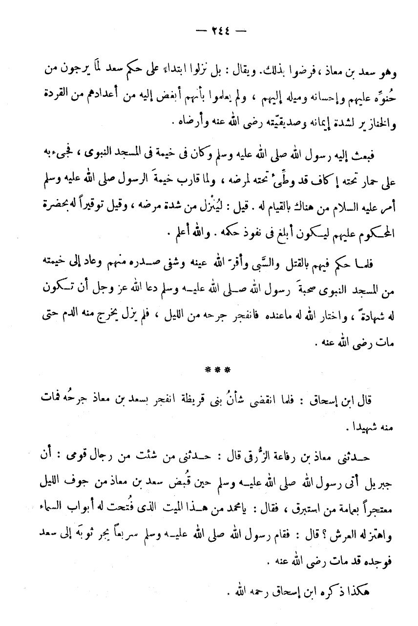 قَالَ ابْنُ إِسْحَاقَ: فَلَمَّا انْقَضَى شَأْنُ بَنِي قُرَيْظَةَ انْفَجَرَ بِسَعْدِ بْنِ مُعَاذٍ جُرْحُهُ فَمَاتَ مِنْهُ شَهِيدًا.